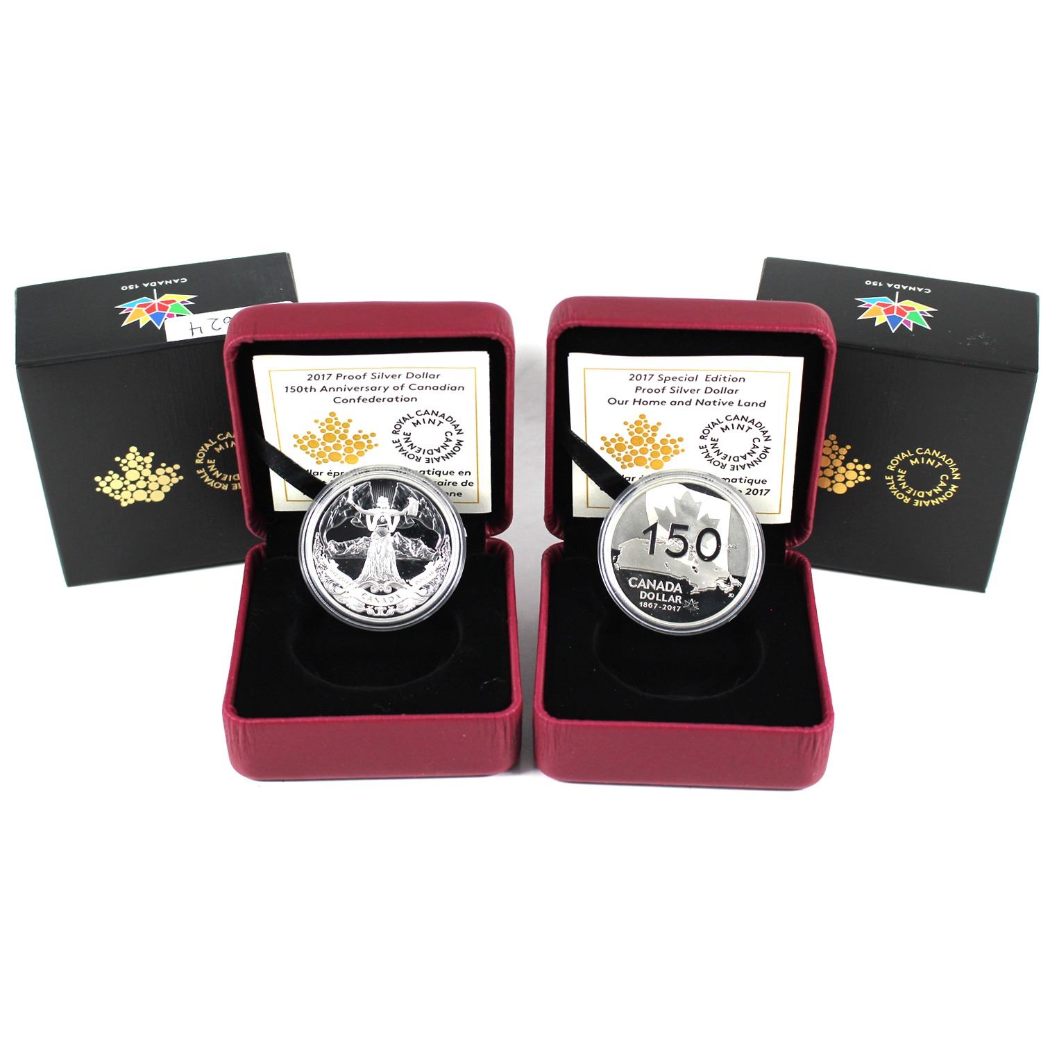 Lot of 2x 2017 Canada Proof Silver Dollars. Includes 150th Anniversary of Canadian Confederation, and Special Edition Our Home and Native Land. Sought after to commemorate an important year!