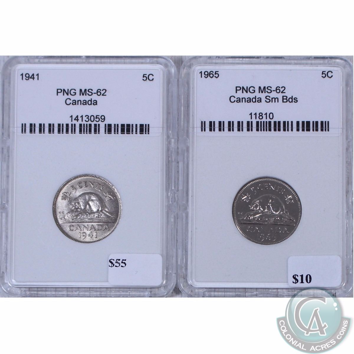 Lot of 2x Canada 5-cent PNG Certified MS-62 - 1941 & 1965 Small Beads. 2pcs