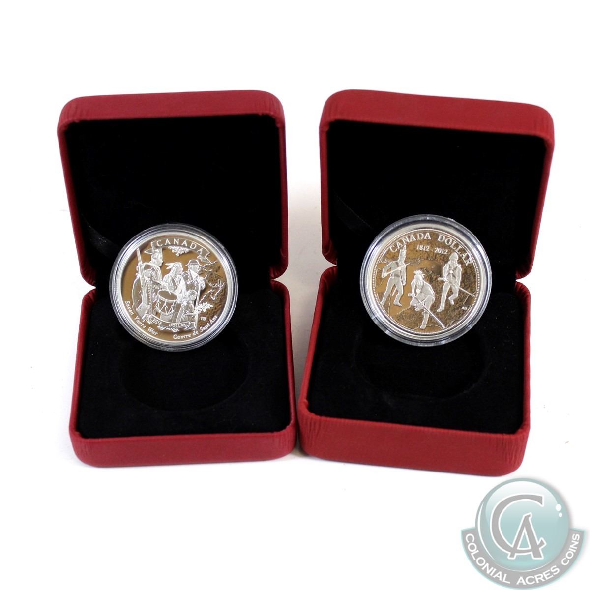 Lot of 2x Canada Commemorative Fine Silver Dollars Encapsulated in Red RCM Display Boxes. You will receive 2012 War of 1812 & 2013 End of the Seven Years War (Capsules scratched) - Tax Exempt (2pcs)