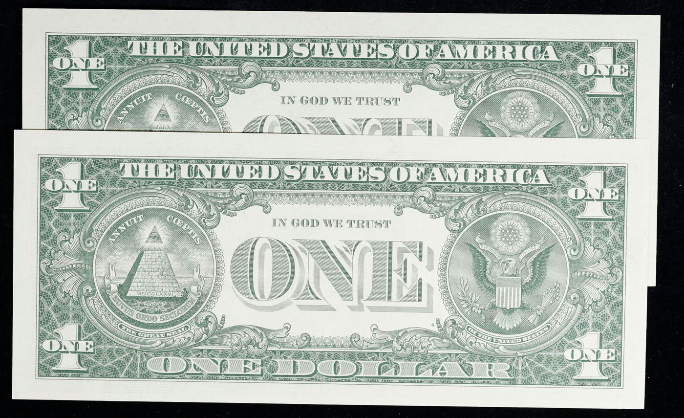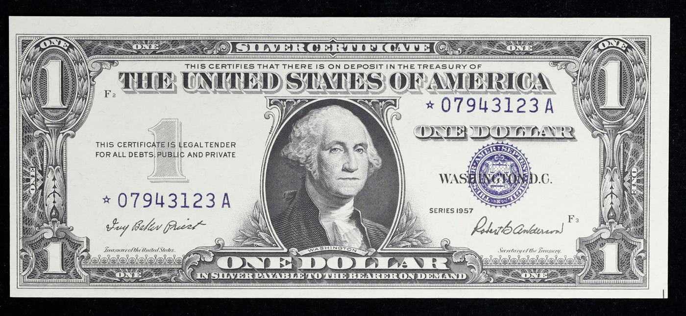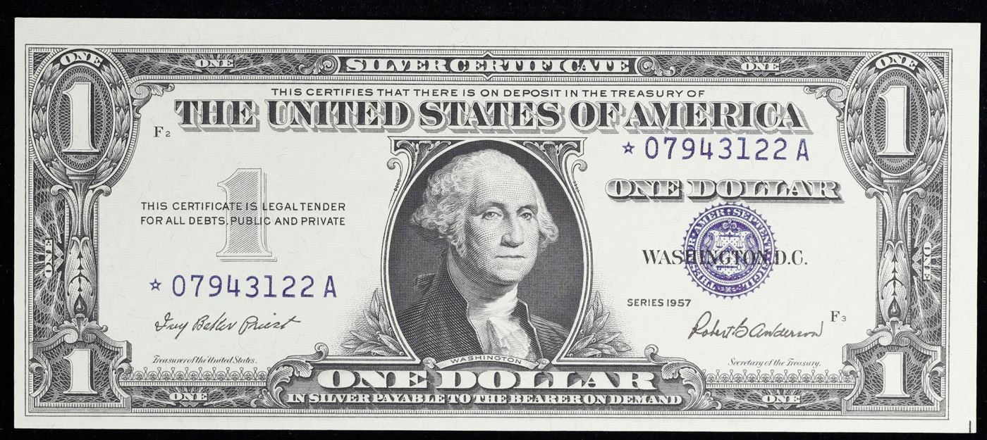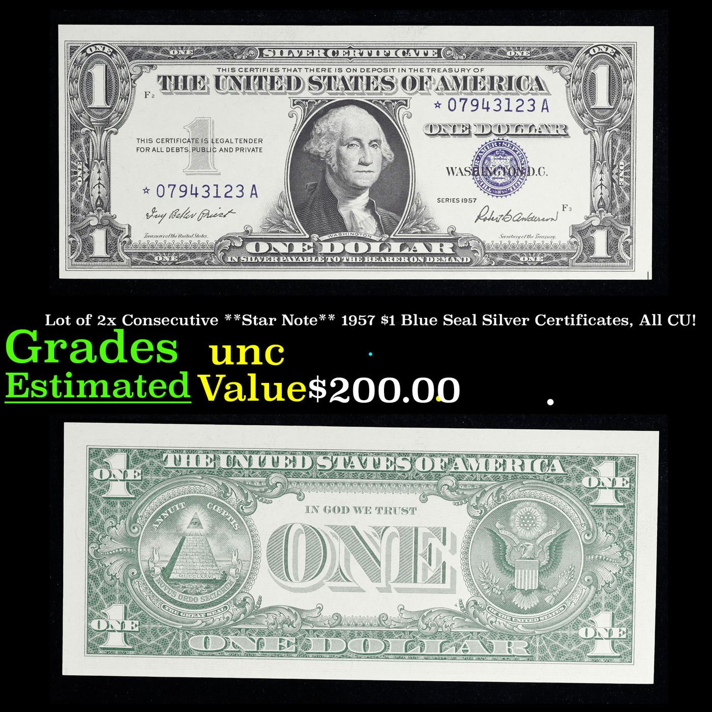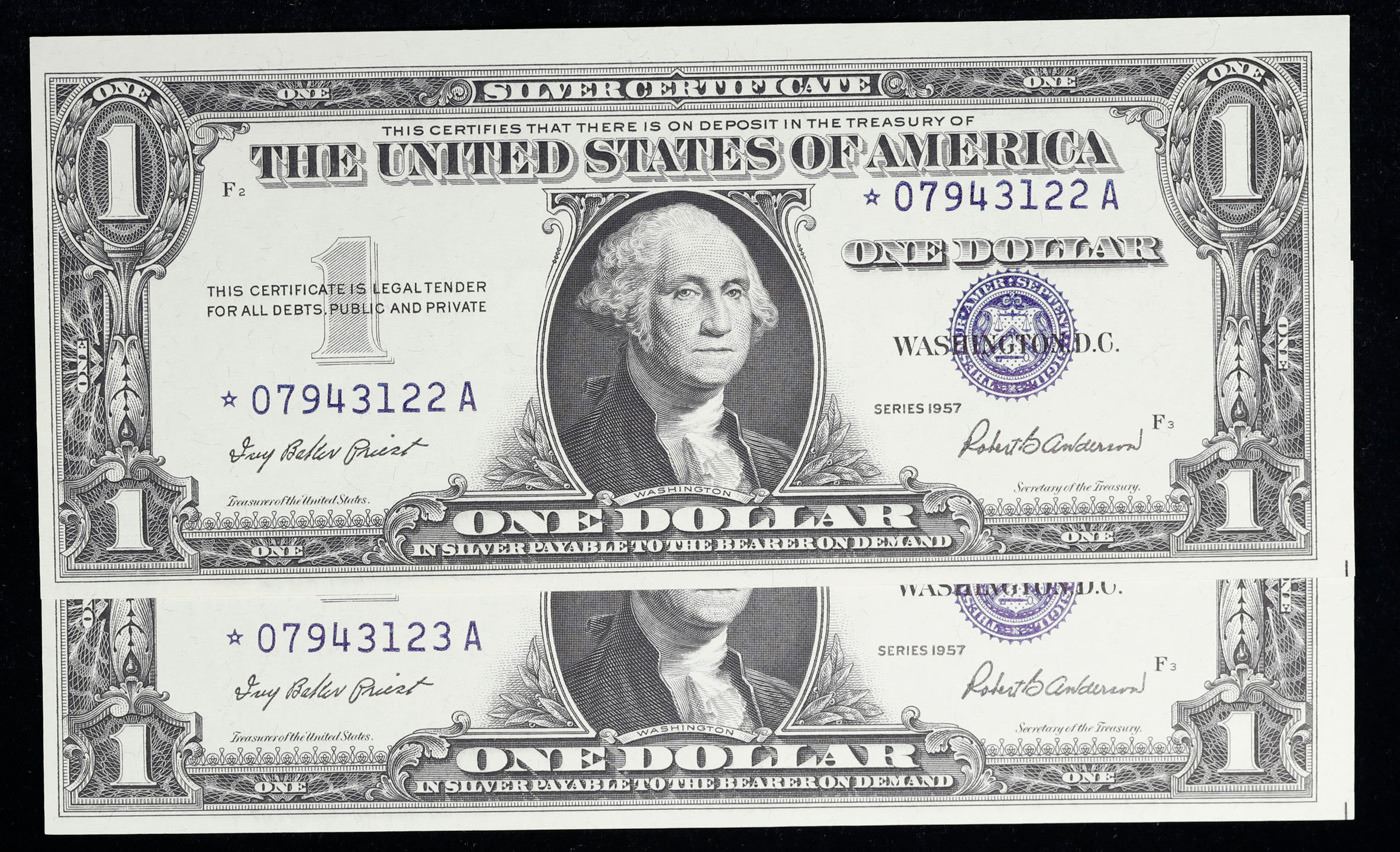 Lot of 2x Consecutive **Star Note** 1957 $1 Blue Seal Silver Certificates, All CU! Grades Brilliant Uncirculated. When notes are discovered that have been printed incorrectly (such as having the serial numbers upside down, etc.) the misprinted "error notes" are replaced with star notes because no two bills within a certain series can be produced with the same serial number. They are used to maintain a correct count of notes in a serial number run. By their nature, star notes are more scarce than notes with standard serial numbers and as such are widely collected by numismatists. Some of the highest prices paid for modern (post-1928) U.S. banknotes have been for star notes. The note itself is a Silver Certificate. Silver Certificates were redeemable in Silver. One of their most distinctive qualities is the blue Treasury seal and serial numbers. These notes include an additional legend printed on the face that is not present on any other Federal Reserve notes. The legend states that Silver had been deposited in the Treasury and was payable on demand to the note’s bearer.