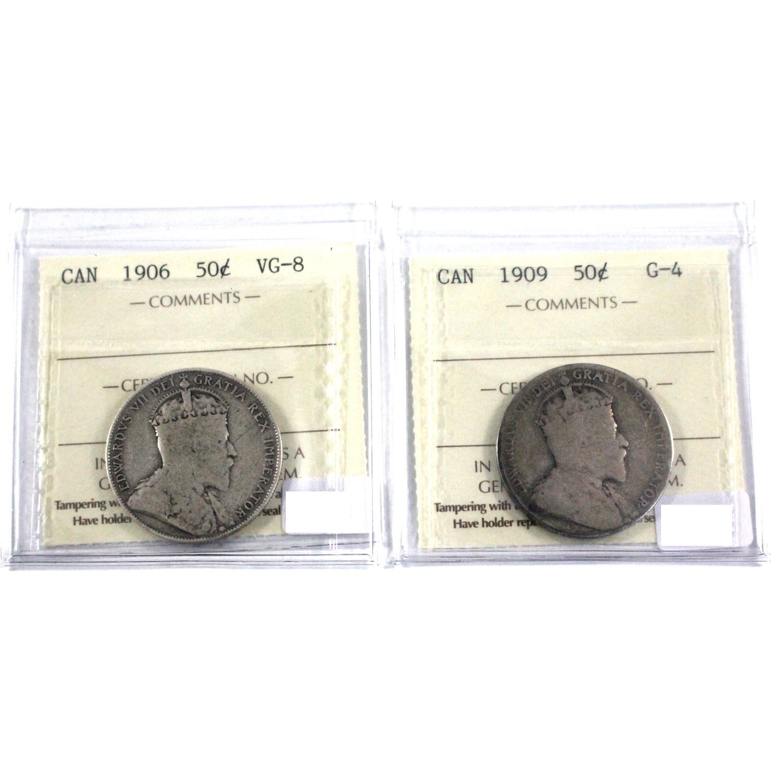 Lot of 2x Edward VII 50-cent, Lot includes 1909 G-4 & 1906 VG-8 both coins ICCS Certified. 2pc
