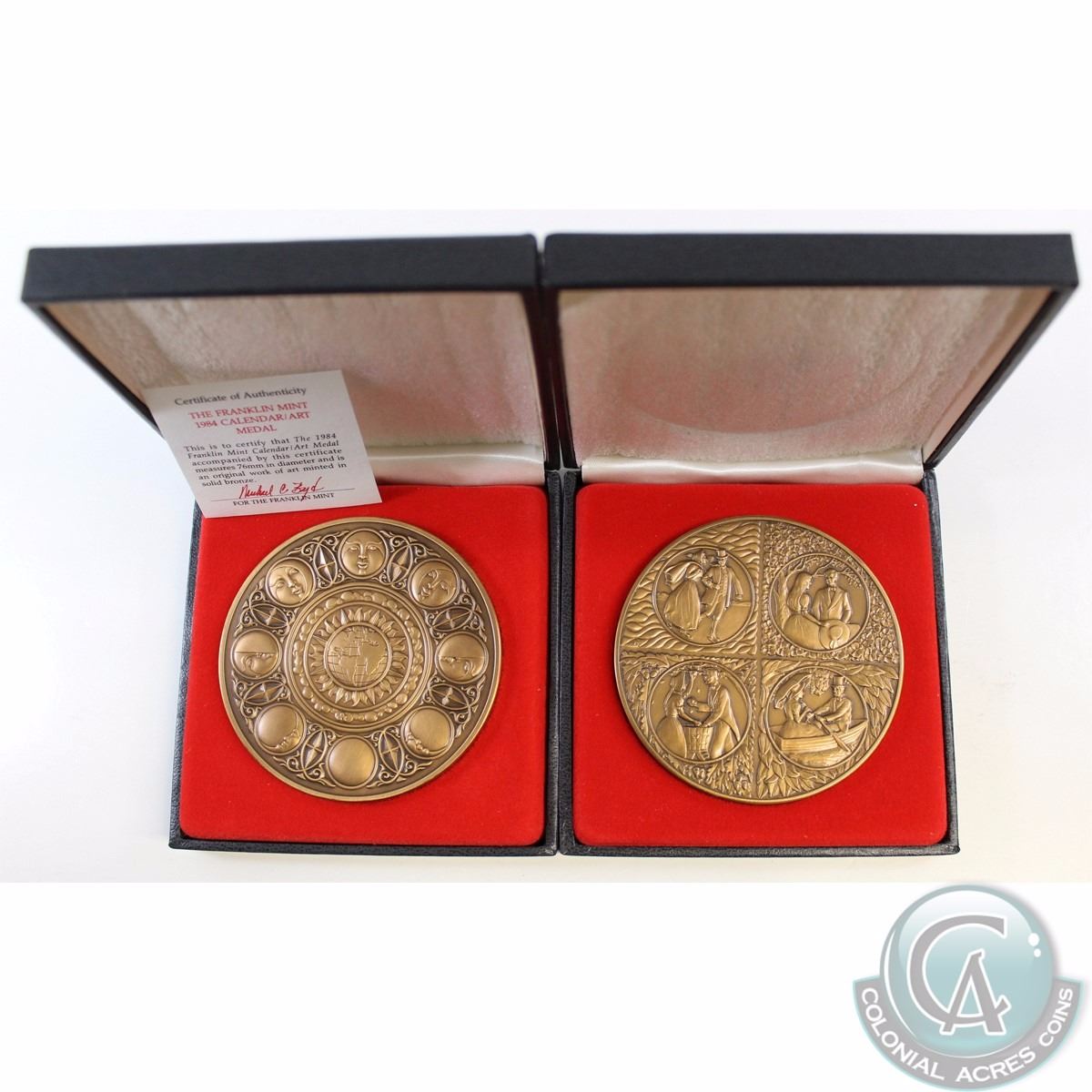 Lot of 2x Franklin Mint Annual Calendar/Art Solid Bronze Medals in Original Boxes Dated 1984 & 1985. 1984 comes with COA. 2pcs