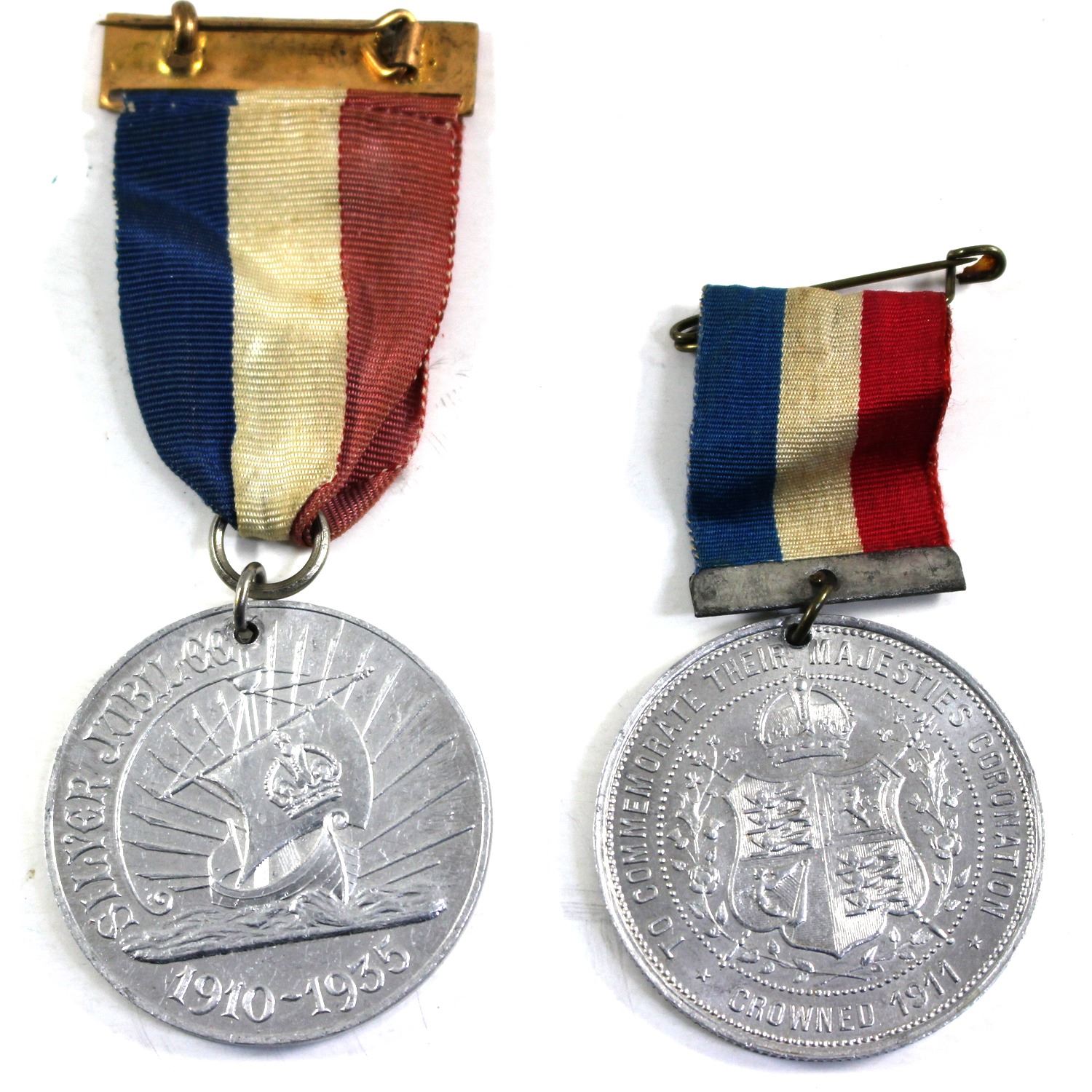 Lot of 2x Great Britain Commemorative Medals for King George V and Queen Mary. Including 1911 Coronation Medal and 1910-1935 Silver Jubilee Medal. Both come with original ribbons. Medals have some scuffing and age showing.