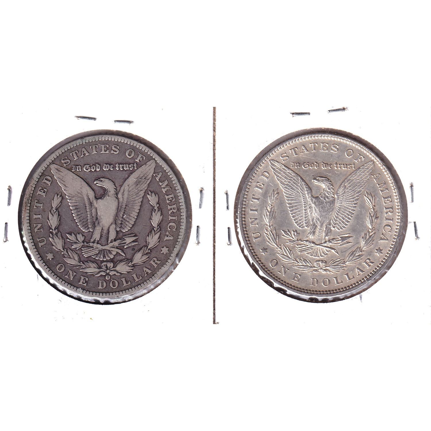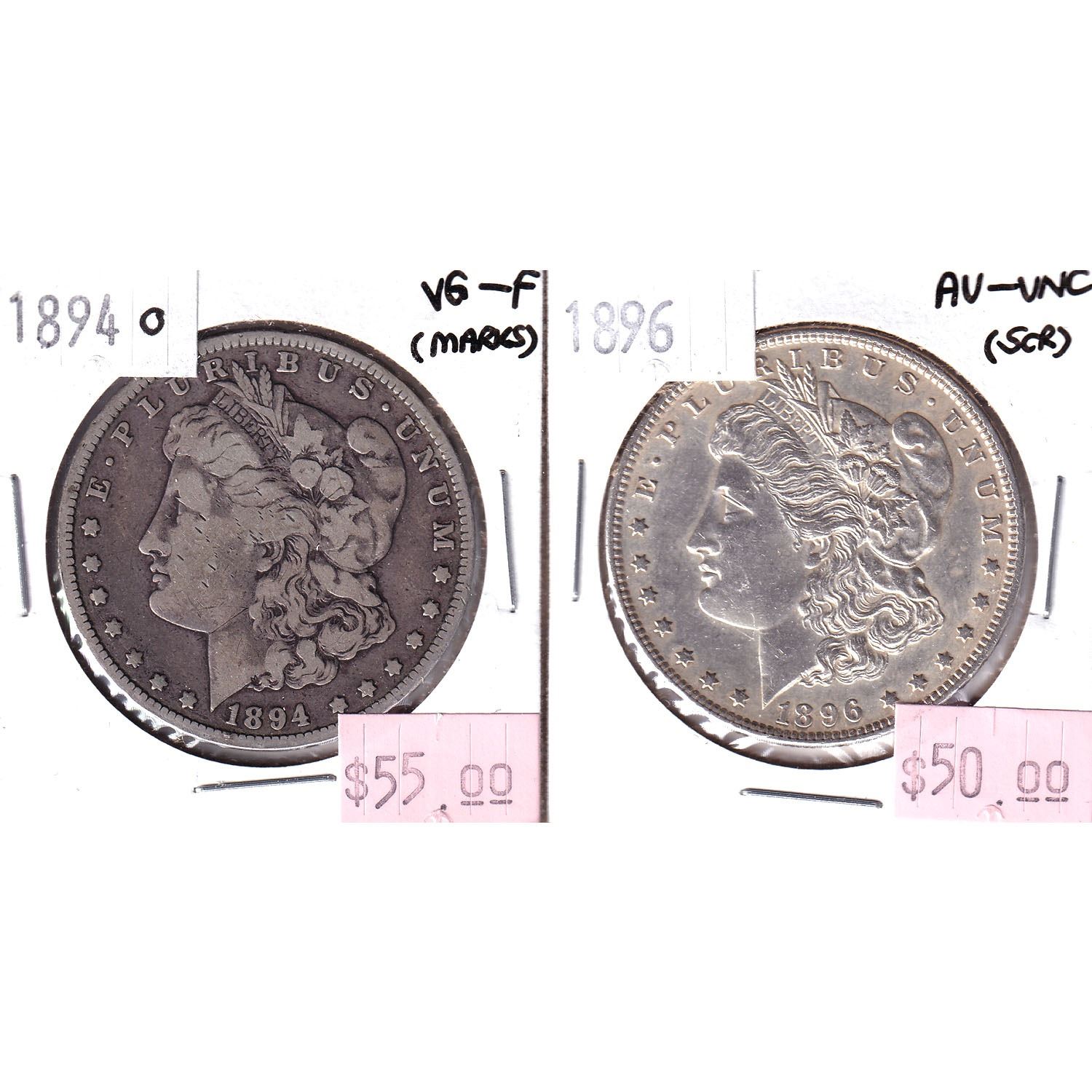 Lot of 2x USA Silver Morgan Dollars. Lot Includes 1894-O VG-F and a 1896 AU-UNC. Coins may be lightly cleaned or impaired. 2pcs