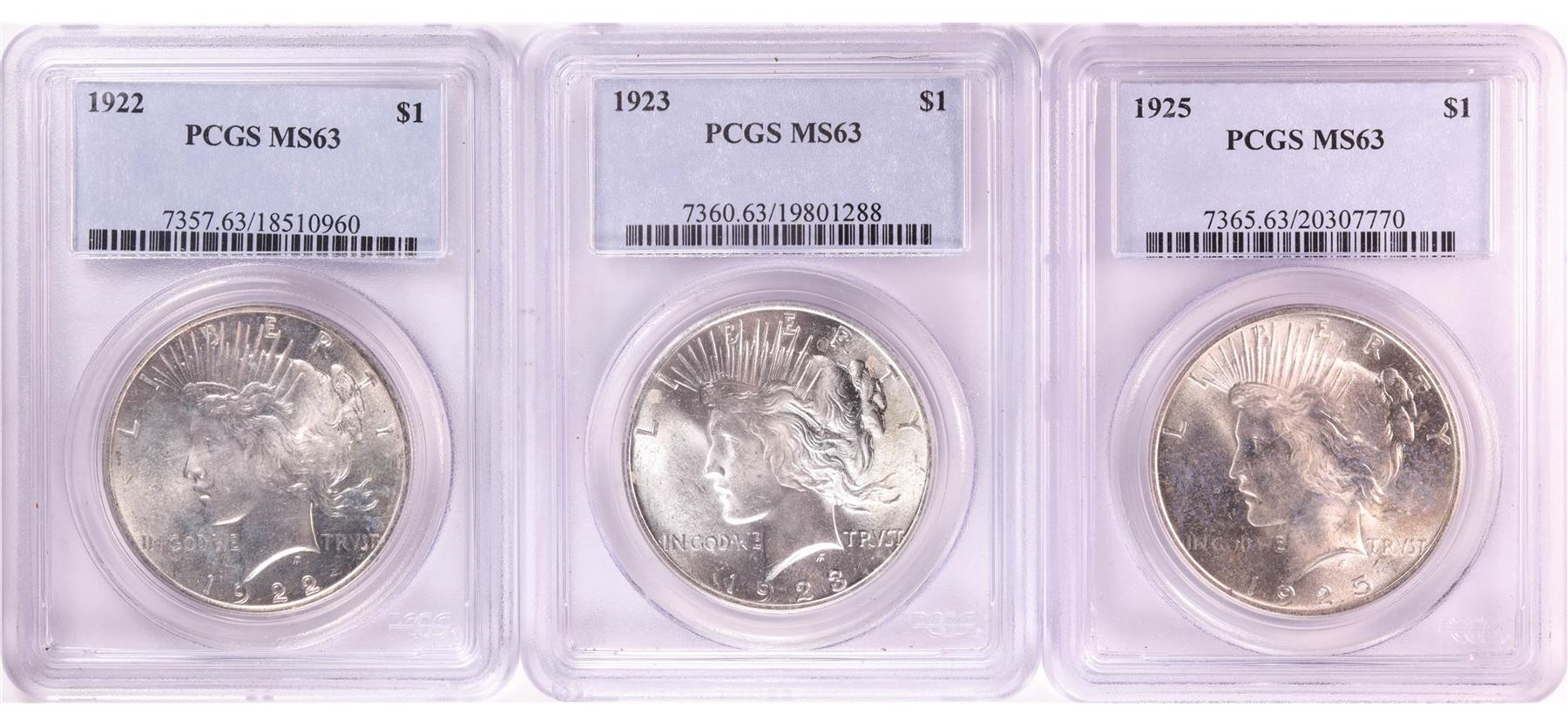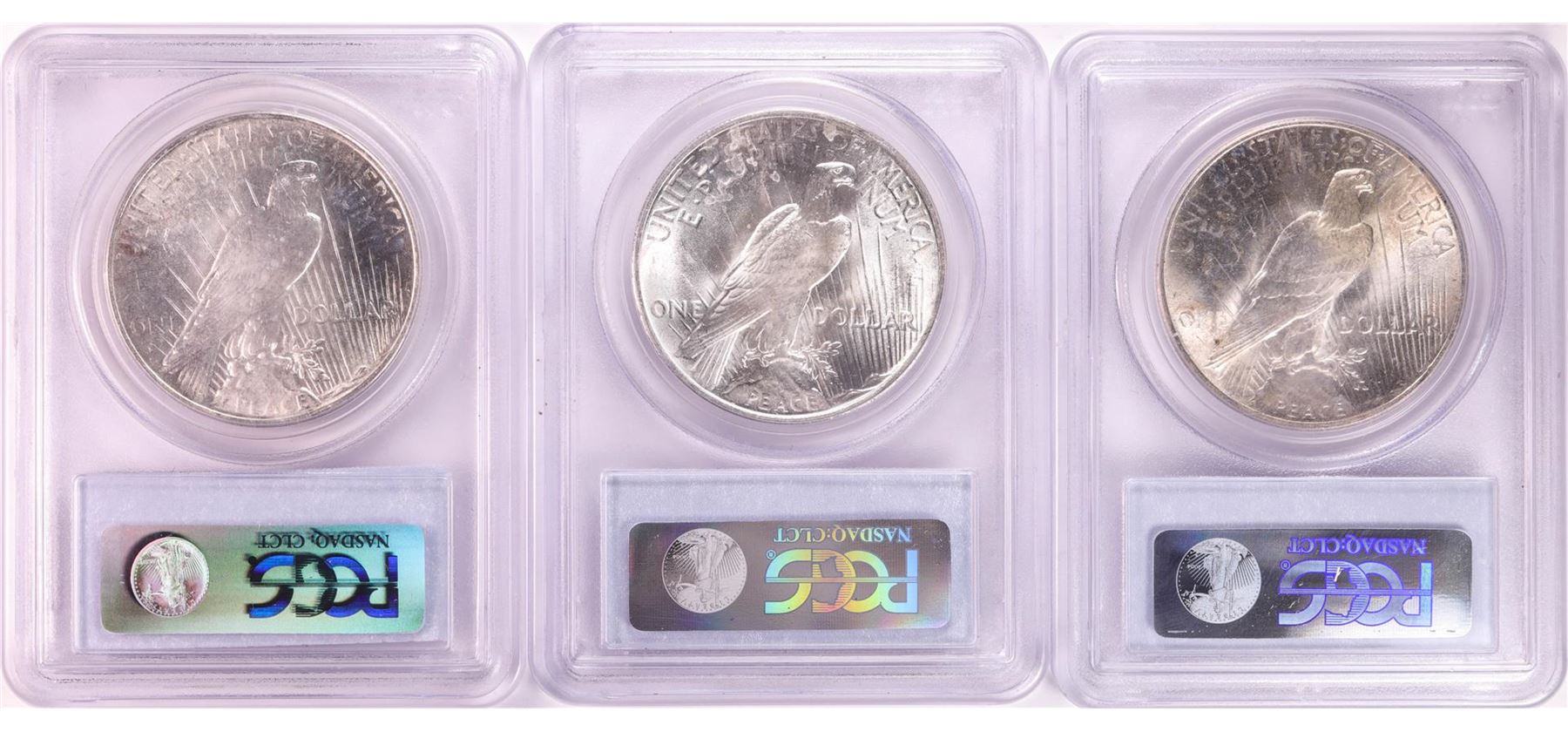 One Lot of (3) $1 Peace Silver Dollar Coins PCGS MS63. PCGS Graded.