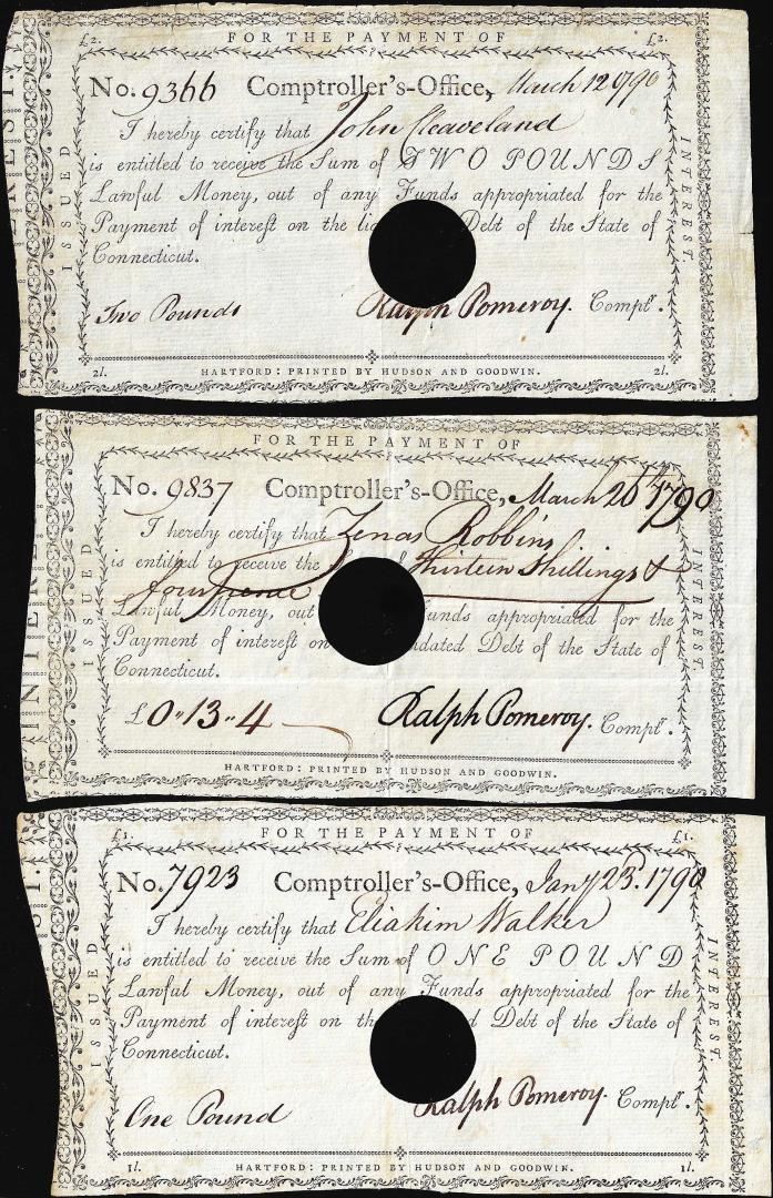 Lot of (3) 1790 Connecticut Comptrollers Office Colonial Currency Notes Cut Canceled