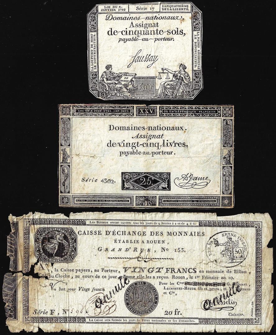 One Lot of (3) 1790's France Domaines-Nationaux Notes.