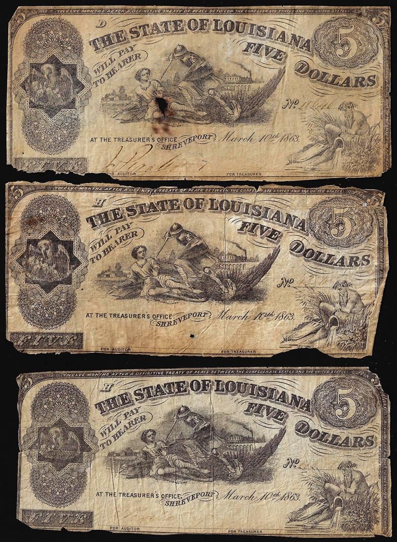 Lot of (3) 1863 $5 The State of Louisiana Baton Rouge, LA Obsolete Banknotes