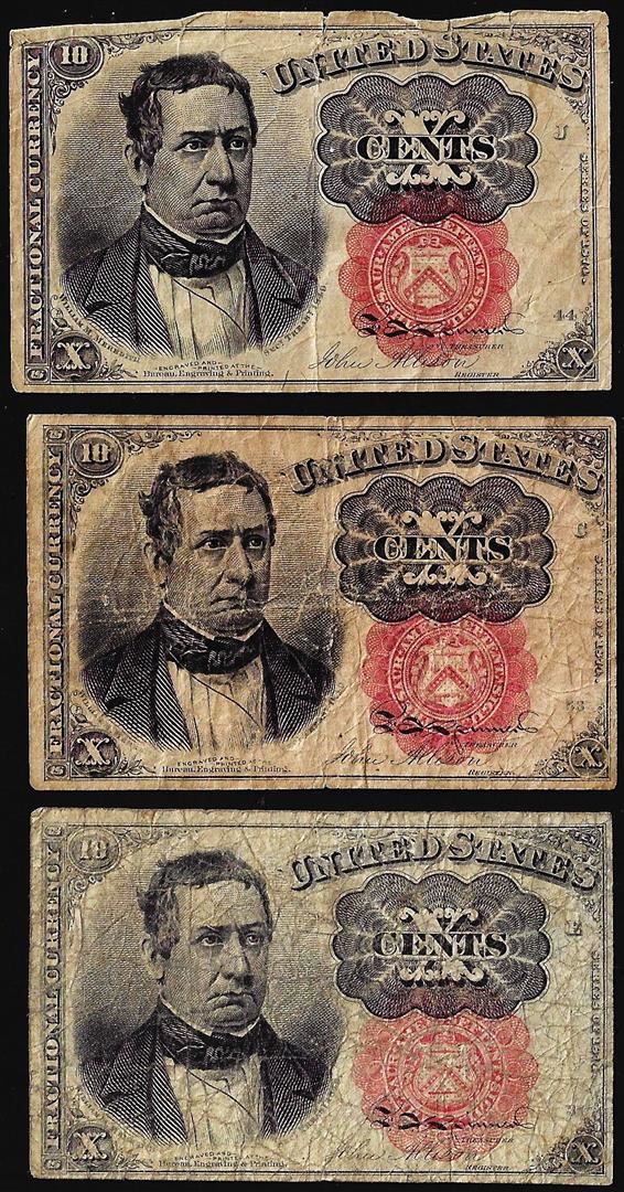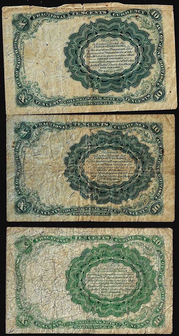 One Lot of (3) 1874 10 Cent Fifth Issue Fractional Currency Note.