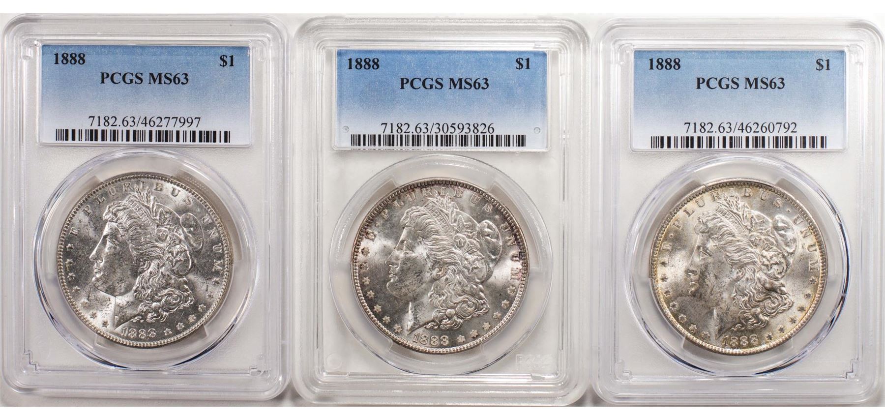One Lot of (3) 1888 $1 Morgan Silver Dollar Coins PCGS MS63. PCGS Graded.