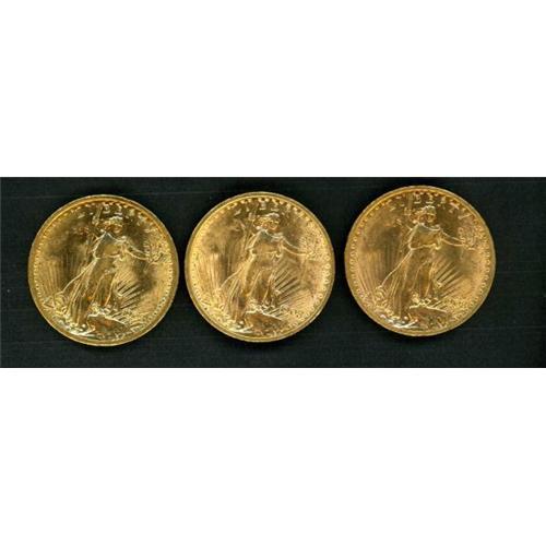 Lot of 3, 1908 $20 Saints Gaudens no motto Raw AU-BU