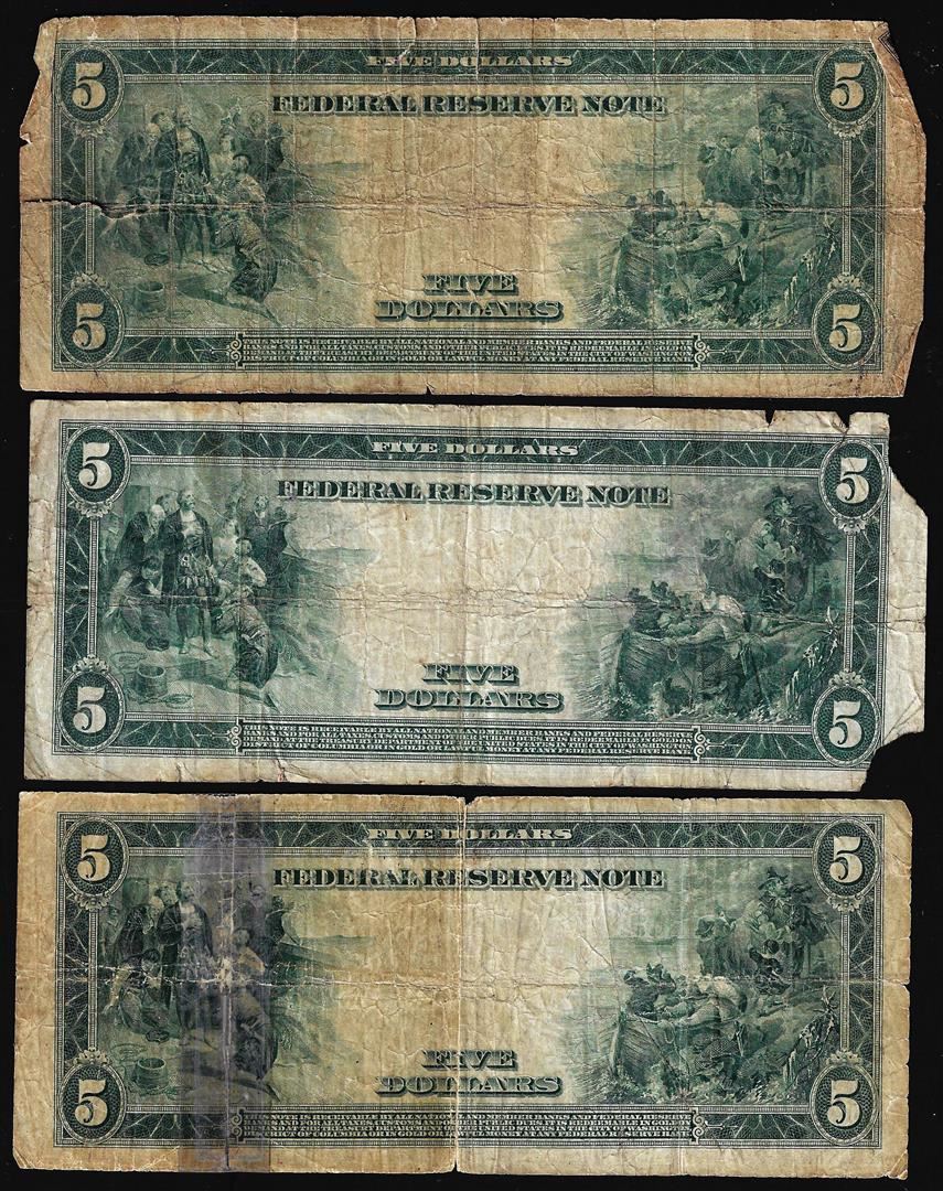 One Lot of (3) 1914 $5 Federal Reserve Bank Notes.