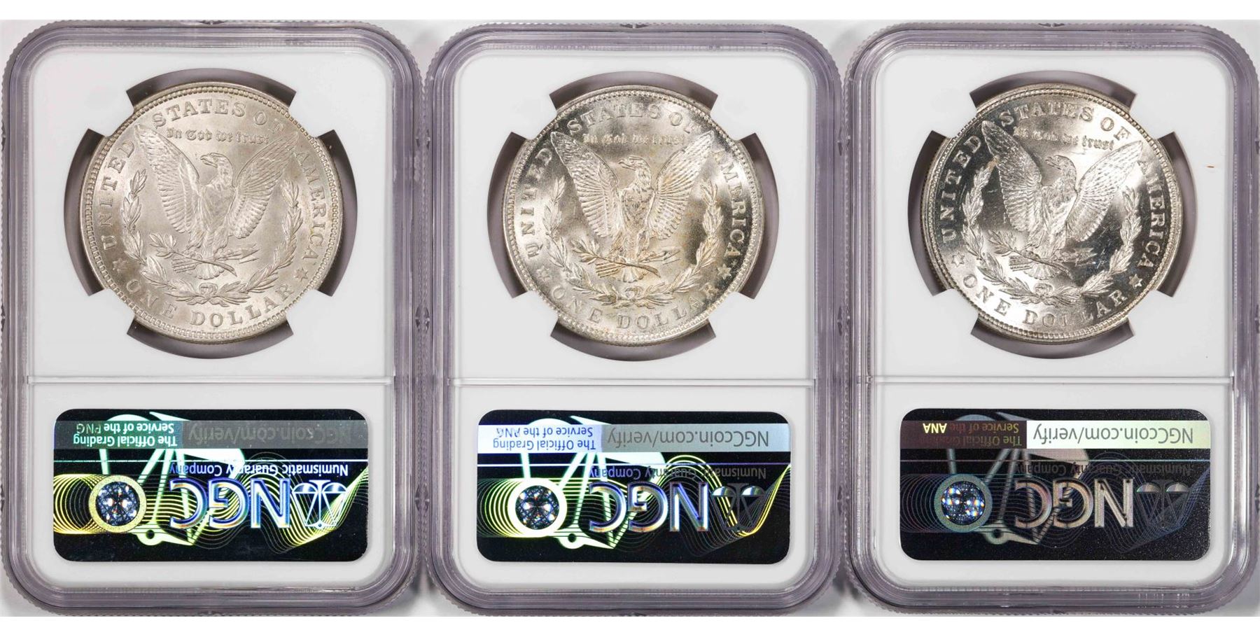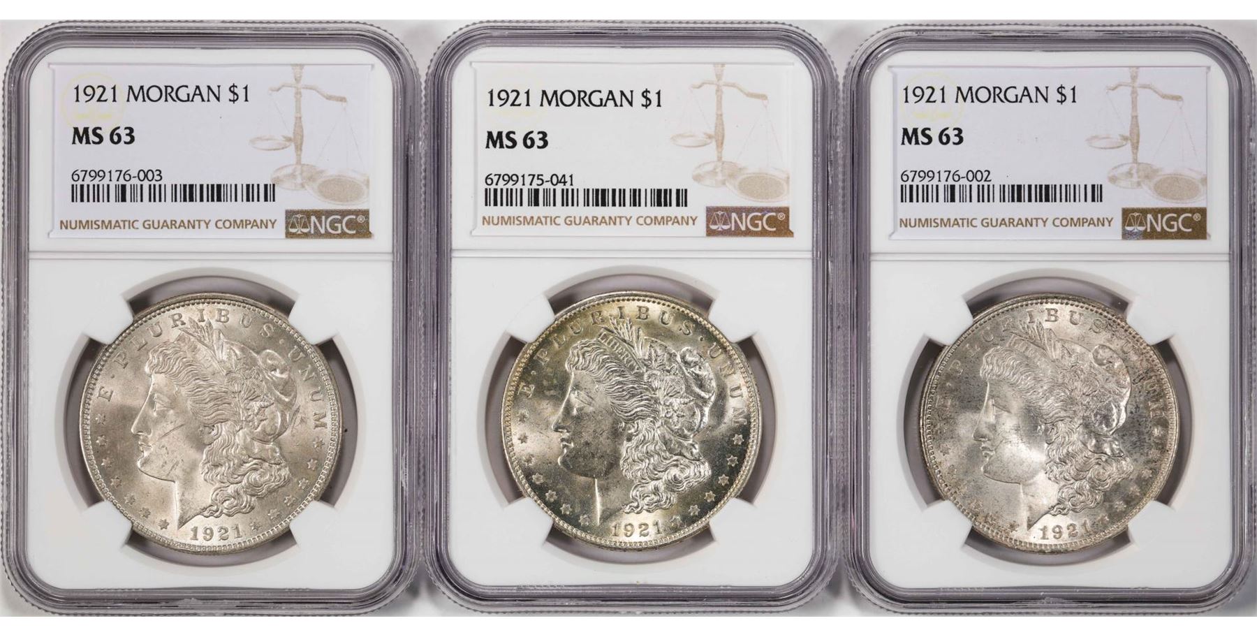 One Lot of (3) 1921 $1 Morgan Silver Dollar Coins NGC MS63. NGC Certified.