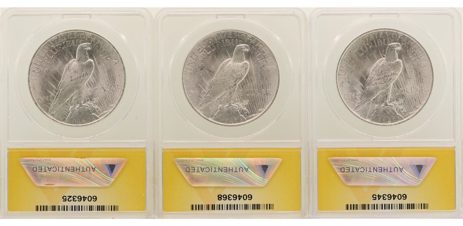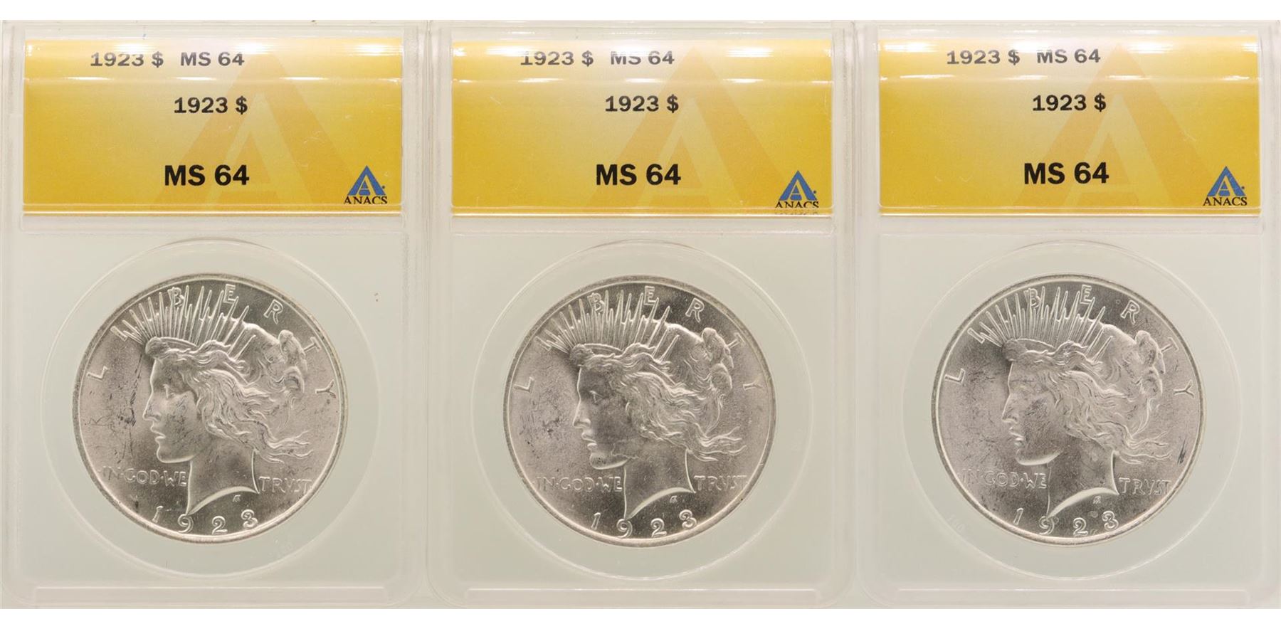 One Lot of (3) 1923 $1 Peace Silver Dollar Coins ANACS MS64. ANACS Certified.