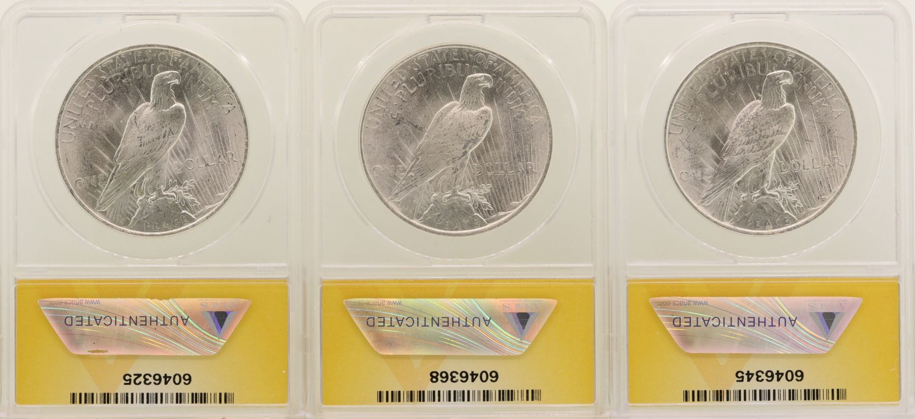 One Lot of (3) 1923 $1 Peace Silver Dollar Coins ANACS MS64.