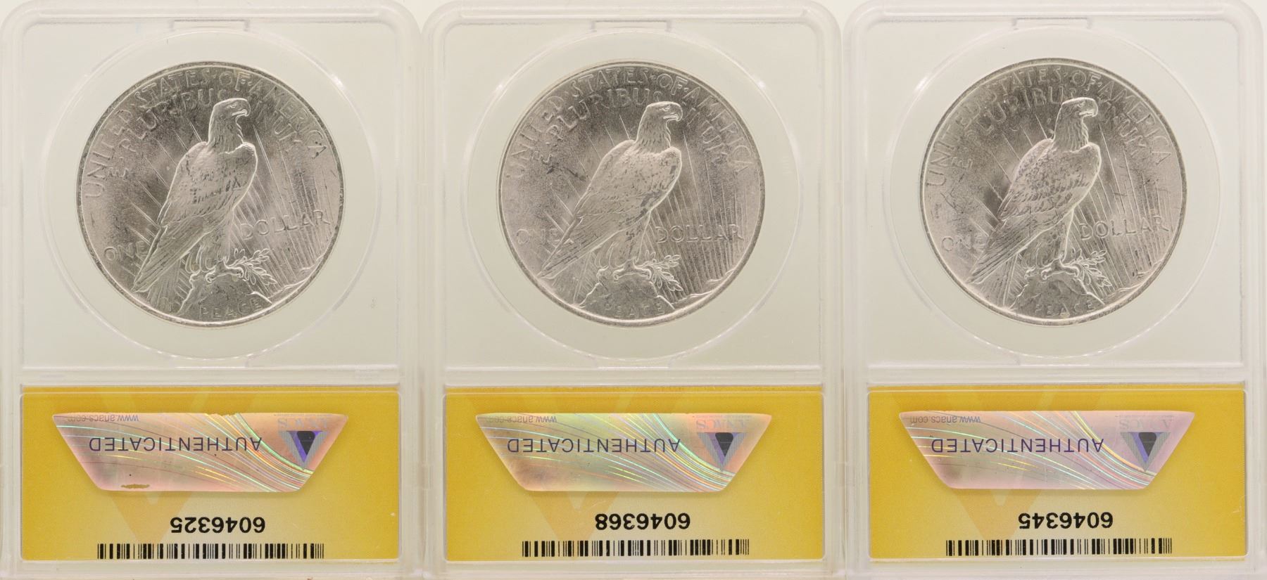 One Lot of (3) 1923 $1 Peace Silver Dollar Coins ANACS MS64.