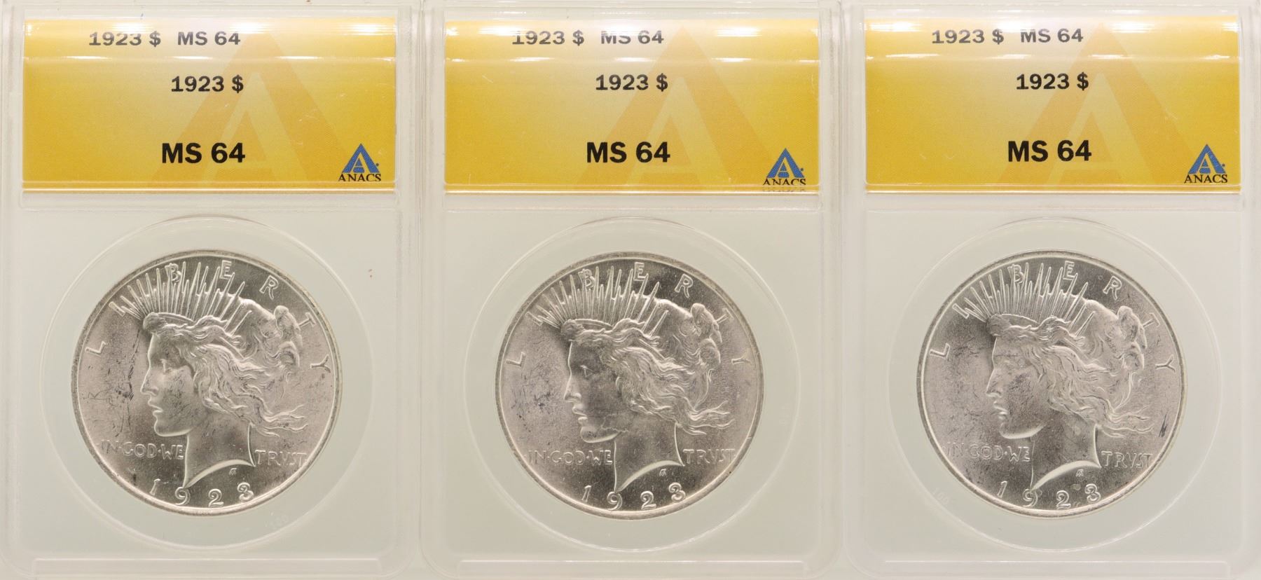 One Lot of (3) 1923 $1 Peace Silver Dollar Coins ANACS MS64.