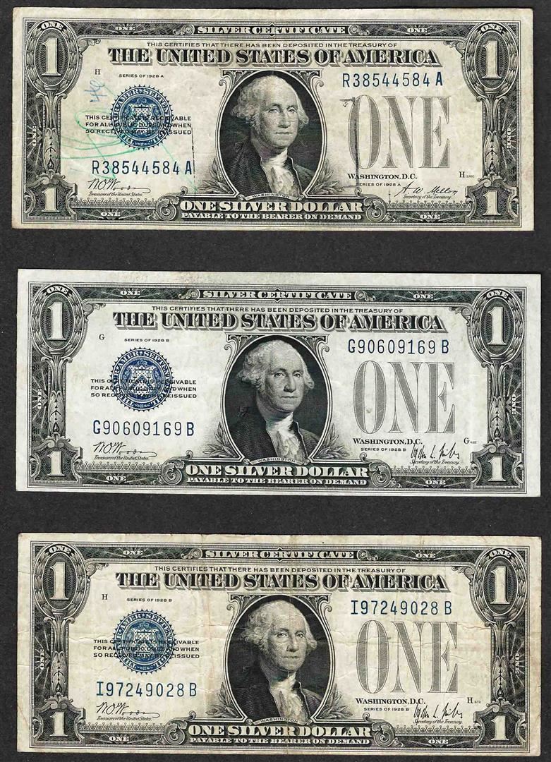 One Lot of (3) 1928 $1 Funnyback Silver Certificate Notes.