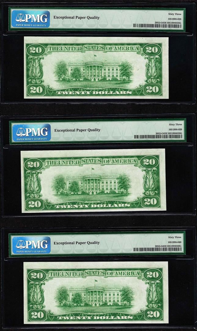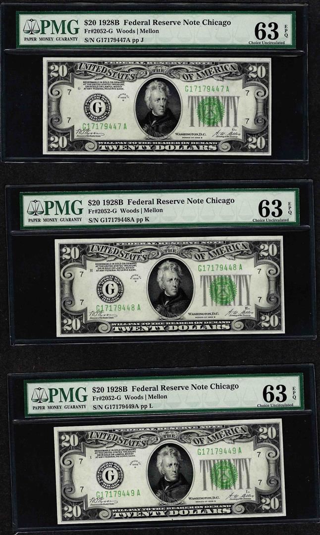 Lot of (3) 1928B $20 Federal Reserve Notes Fr.2052-G PMG Choice Uncirculated 63E