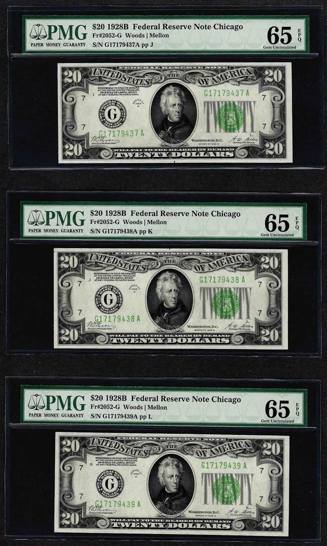 One Lot of (3) 1928B $20 Federal Reserve Notes Fr.2052-G PMG Gem Uncirculated 65EPQ. PMG Certified.
