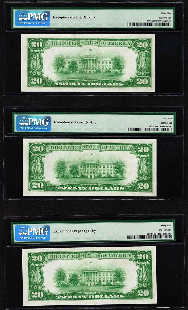 Lot of (3) 1928B $20 Federal Reserve Notes Fr.2052-G PMG Gem Uncirculated 65EPQ