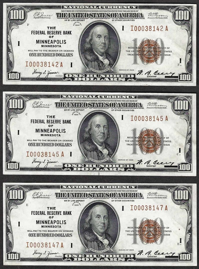 One Lot of (3) 1929 $100 Federal Reserve Bank of Minneapolis Notes.