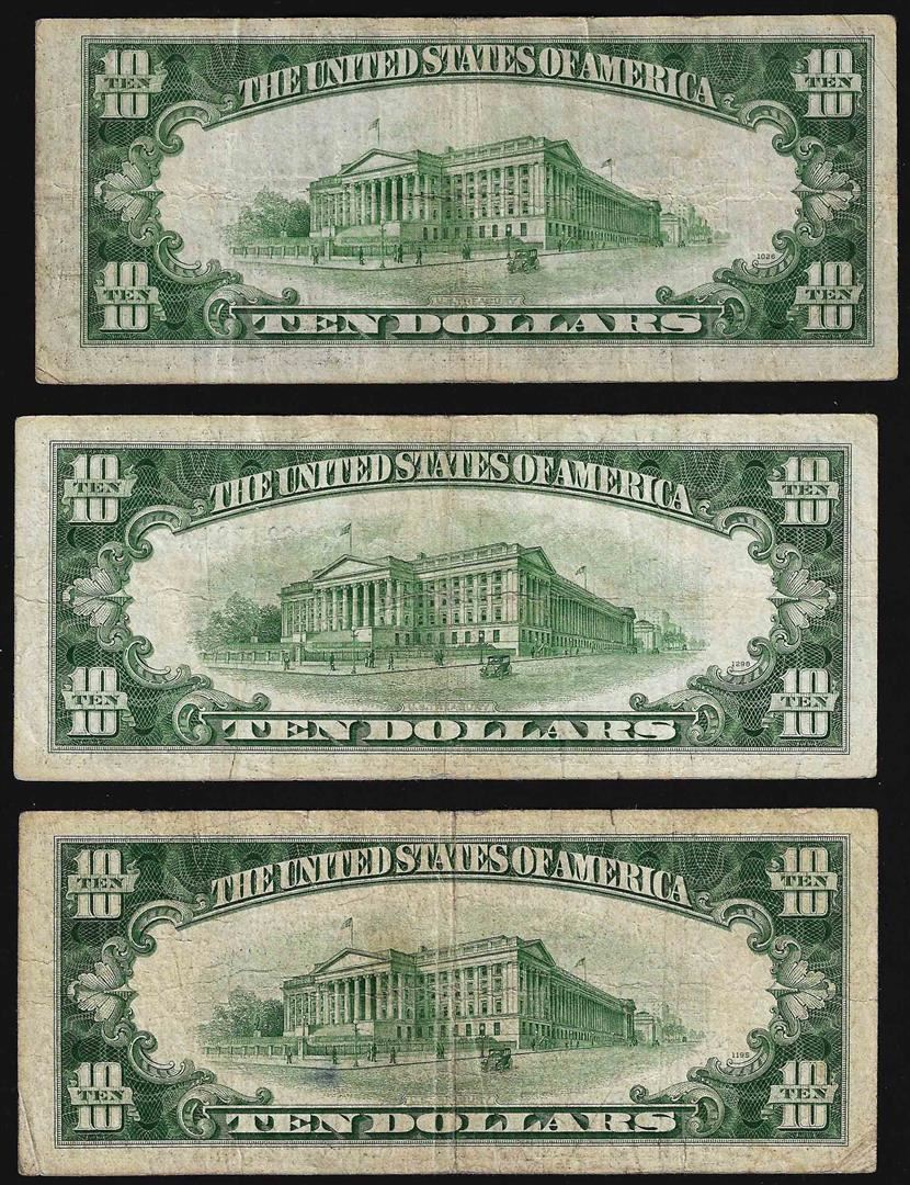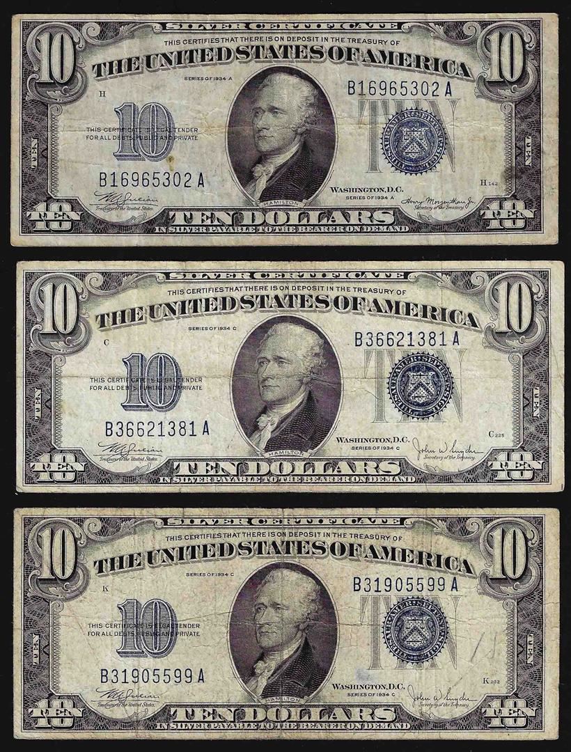 One Lot of (3) 1934 $10 Silver Certificate Notes.
