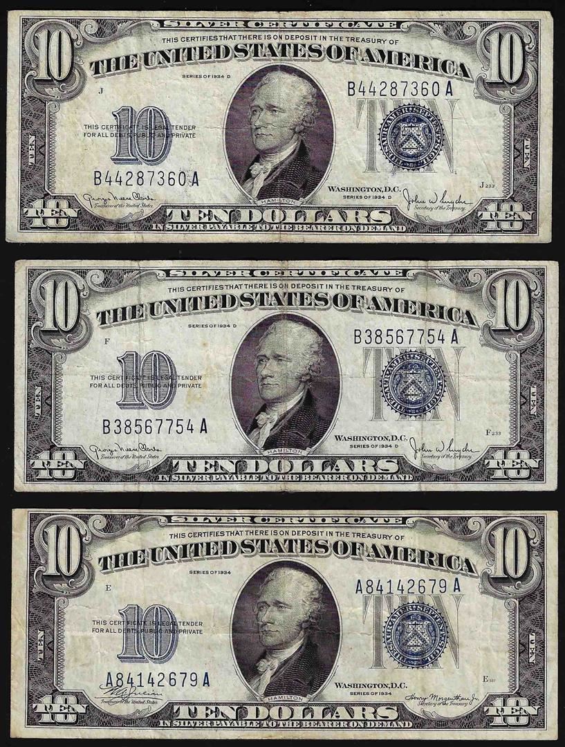 One Lot of (3) 1934 $10 Silver Certificate Notes.