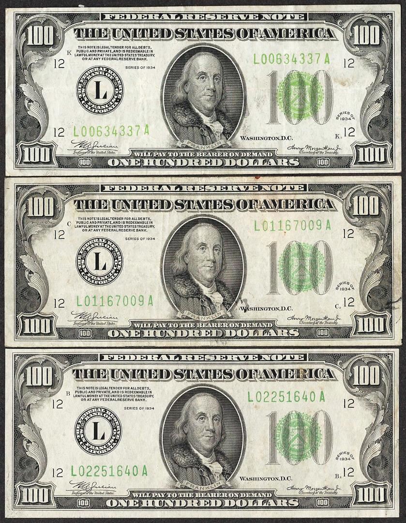 One Lot of (3) 1934 $100 Federal Reserve Notes San Francisco.