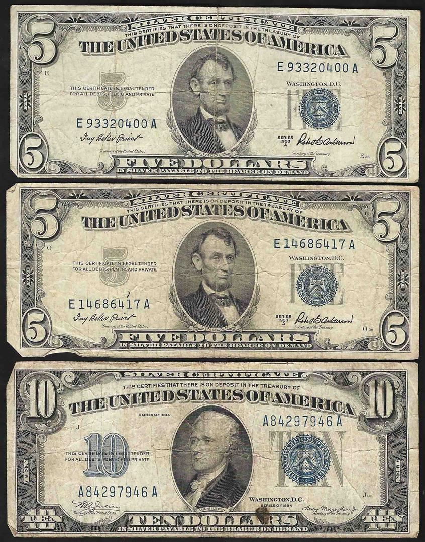 One Lot of (3) 1934 & 1953 Silver Certificate Notes.