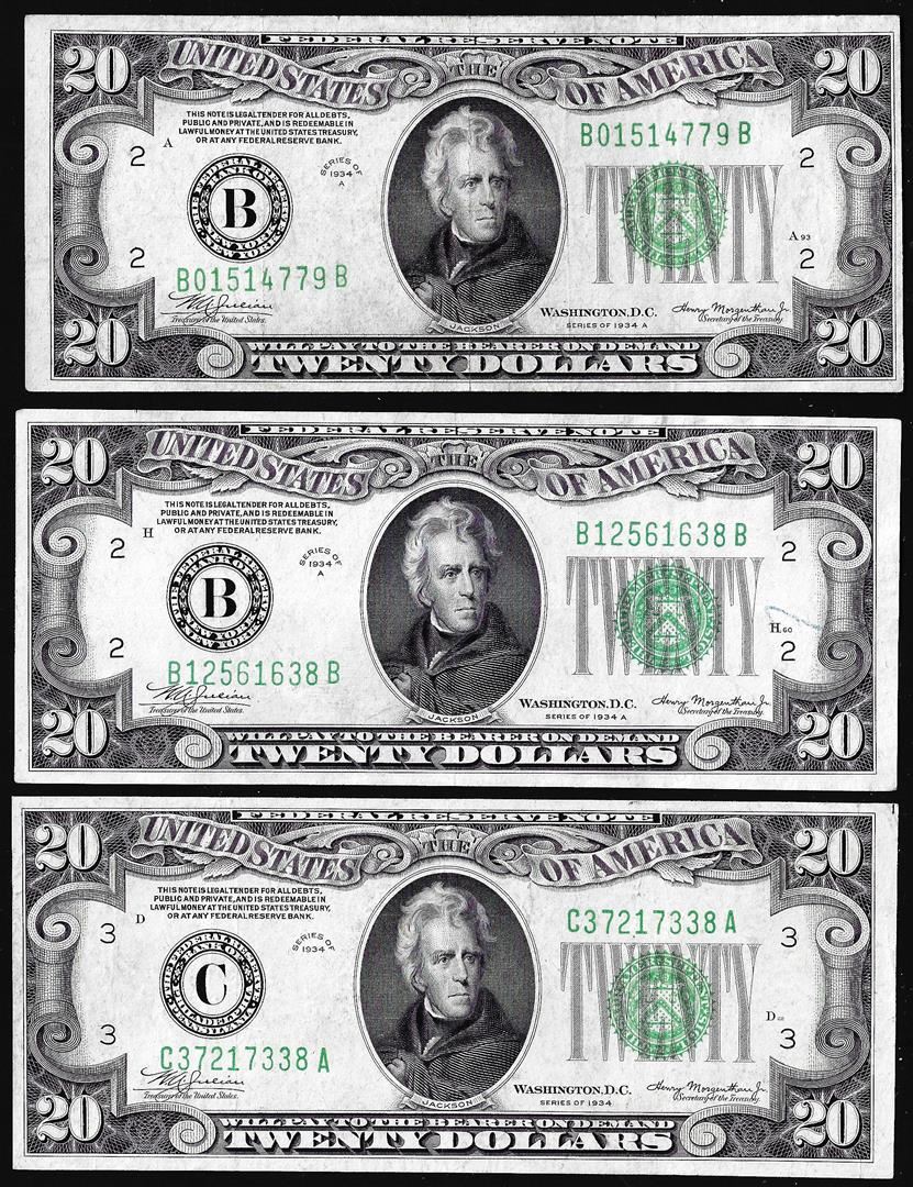 One Lot of (3) 1934 $20 Federal Reserve Notes.