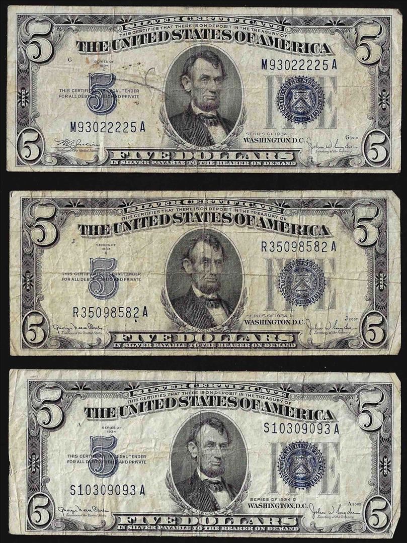 One Lot of (3) 1934 $5 Silver Certificate Notes.