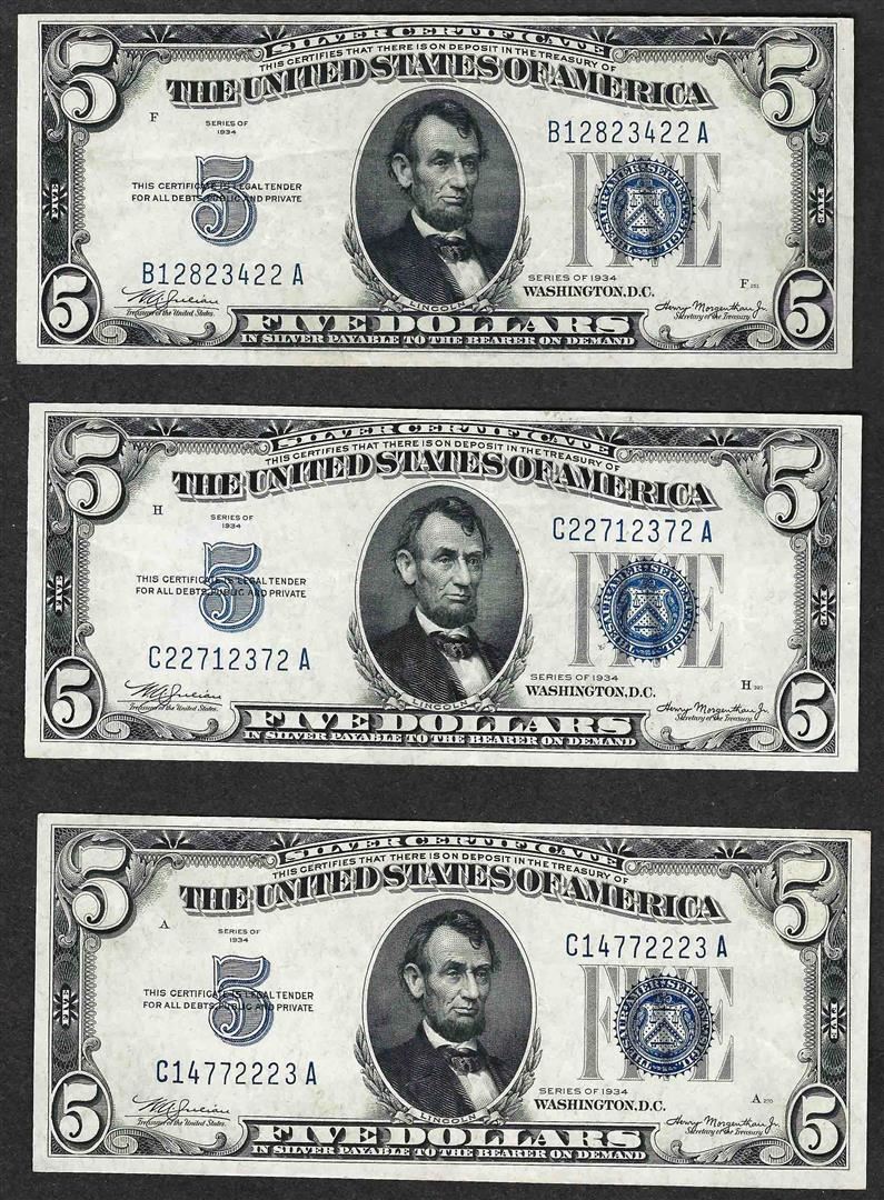 One Lot of (3) 1934 $5 Silver Certificate Notes.