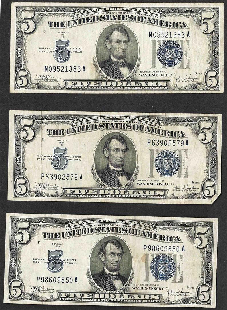 One Lot of (3) 1934C $5 Silver Certificate Notes.