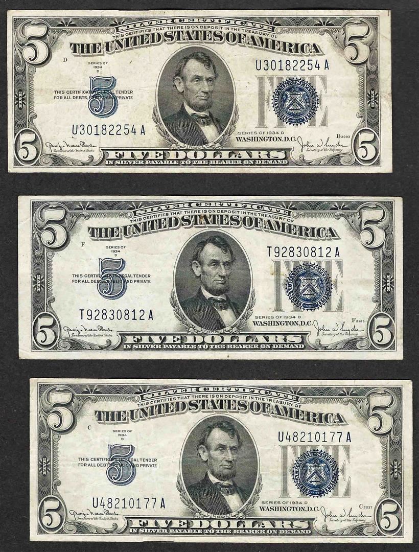 One Lot of (3) 1934D $5 Silver Certificate Notes.