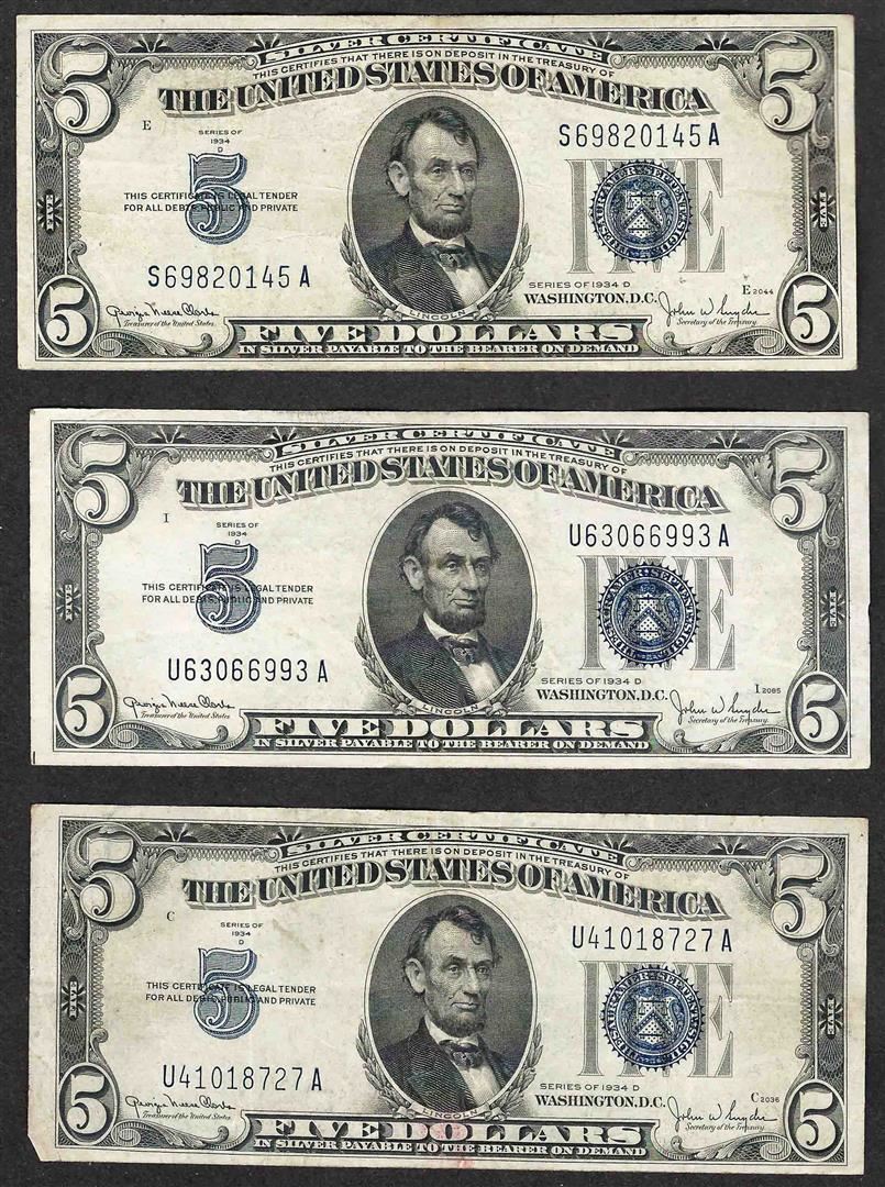 One Lot of (3) 1934D $5 Silver Certificate Notes.