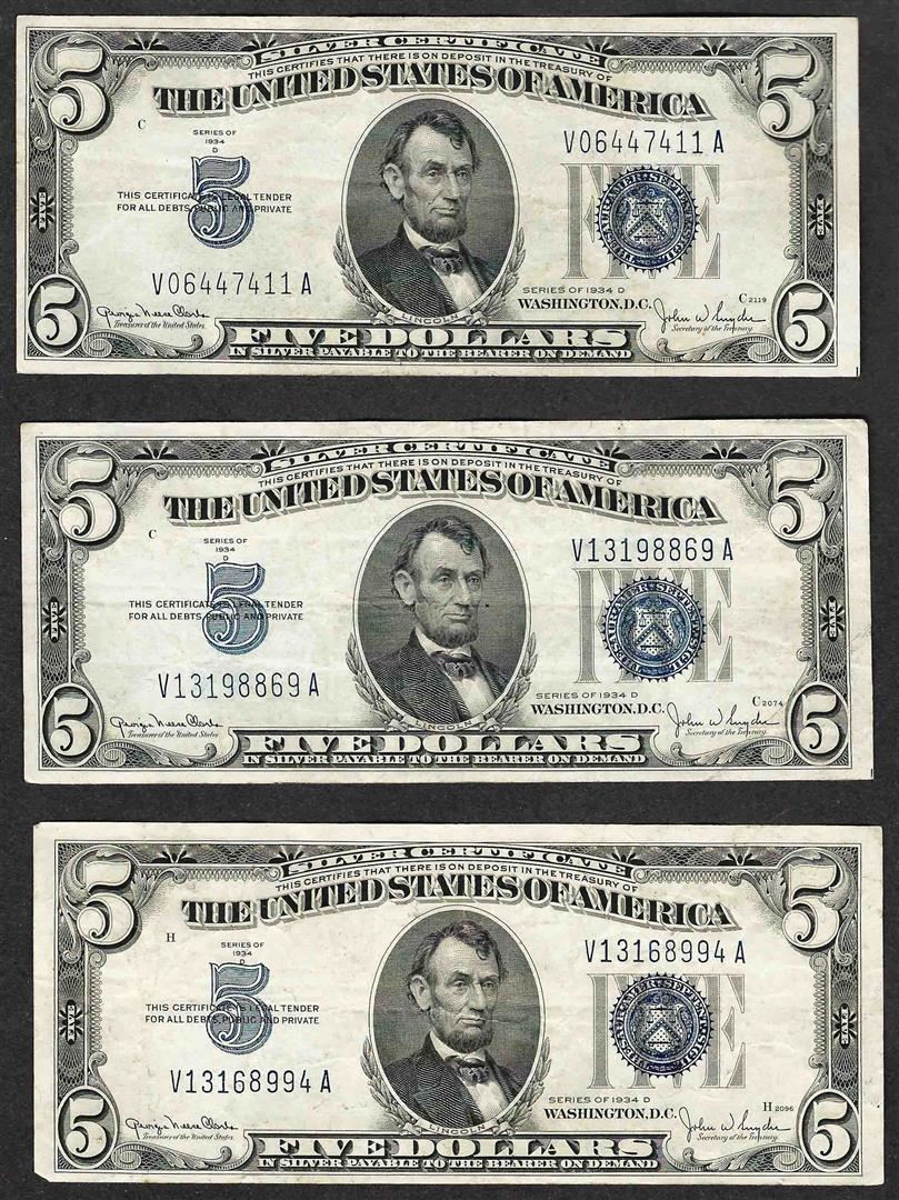 One Lot of (3) 1934D $5 Silver Certificate Notes.