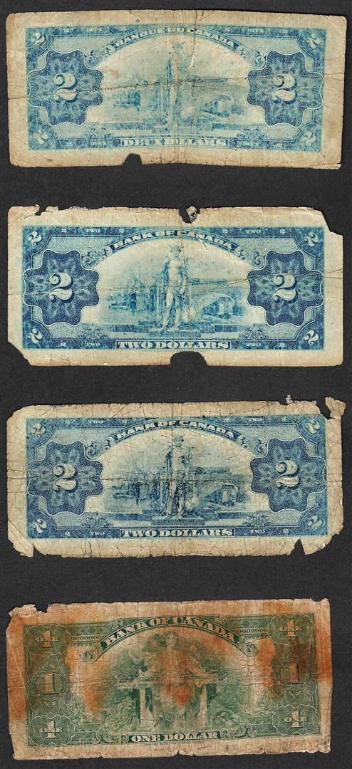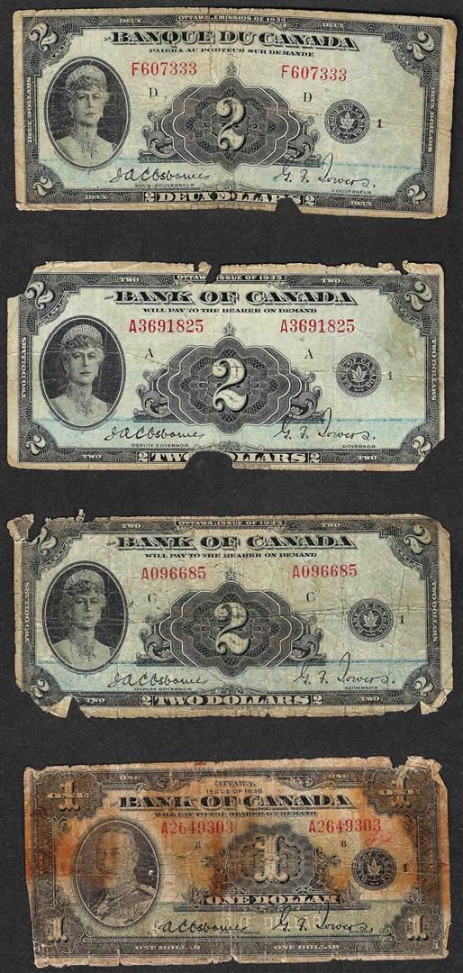 One Lot of (3) 1935 $2 & (1) 1935 $1 Bank of Canada Notes.