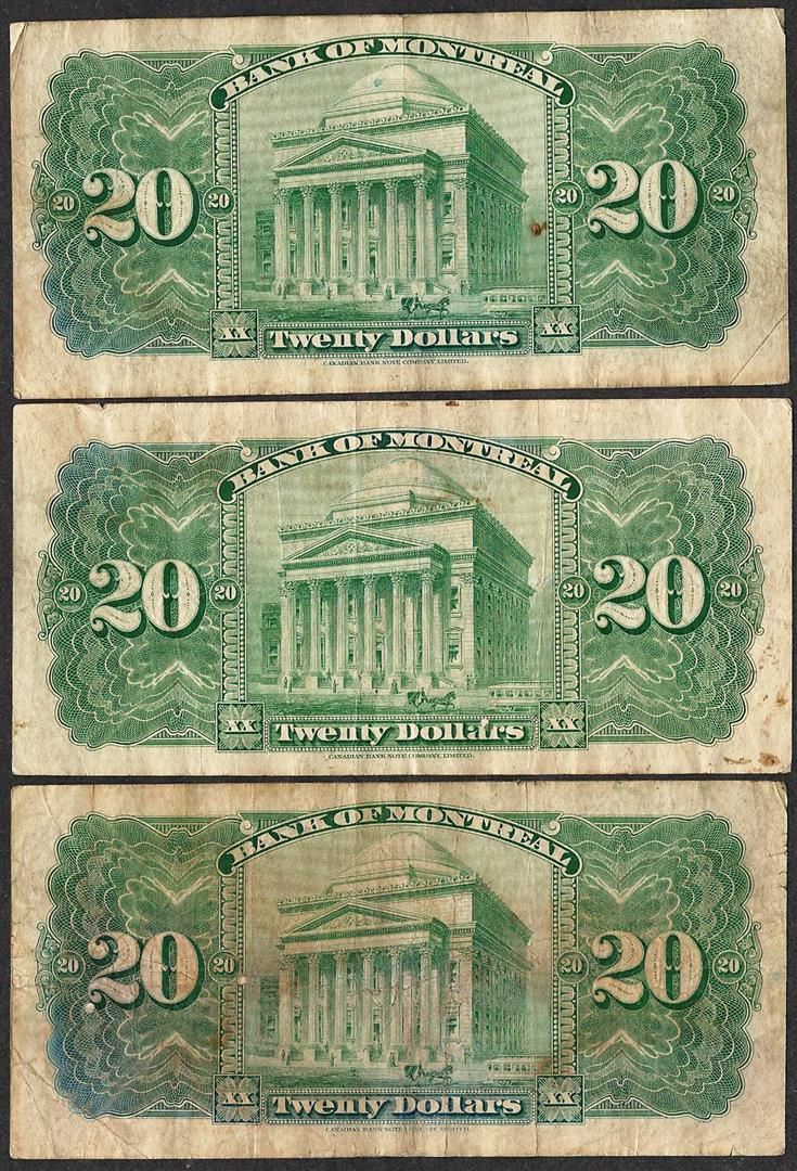 One Lot of (3) 1935 $20 The Bank of Montreal Canada Notes.