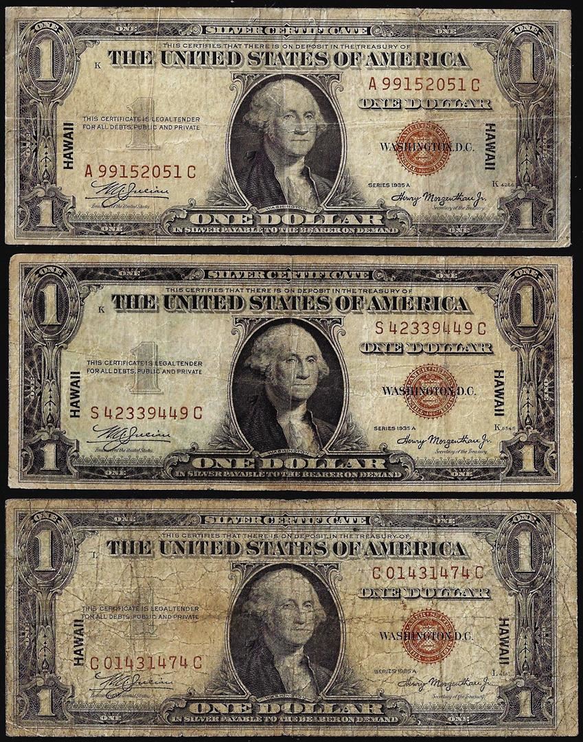 Lot of (3) 1935A $1 Hawaii WWII Emergency Issue Silver Certificate Notes