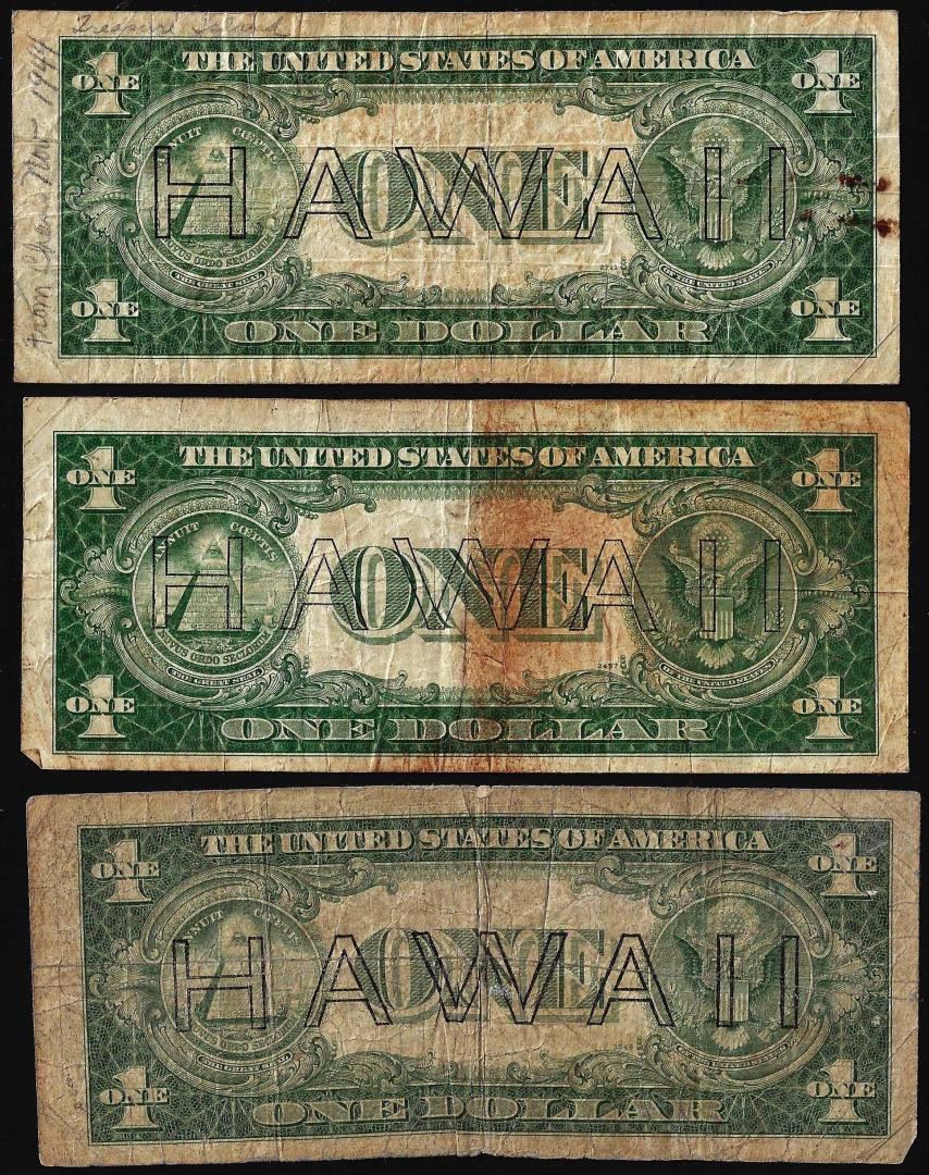 One Lot of (3) 1935A $1 Hawaii WWII Emergency Issue Silver Certificate Notes.