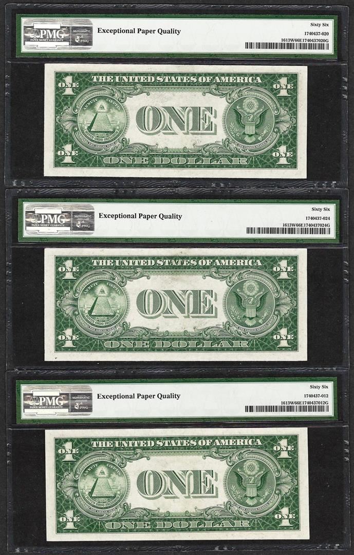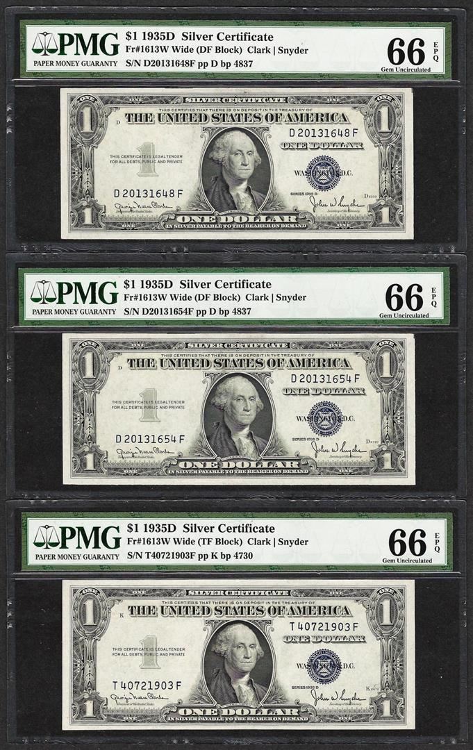 One Lot of (3) 1935D $1 Silver Certificate Notes Fr.1613W PMG Gem Uncirculated 66EPQ. PMG Certified.