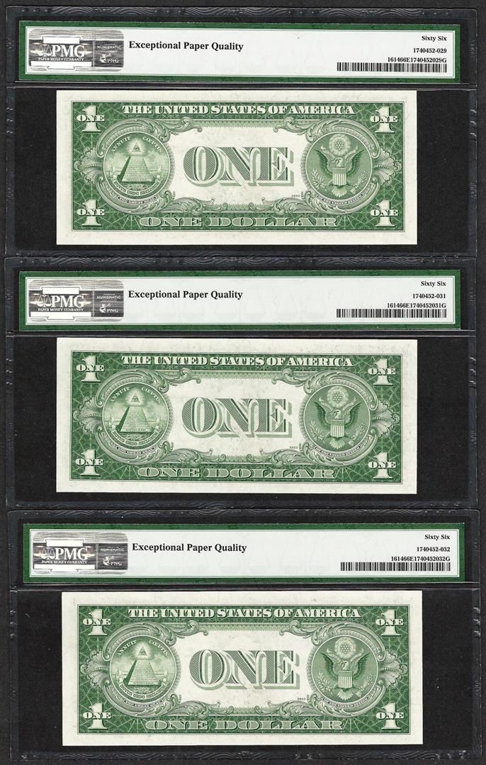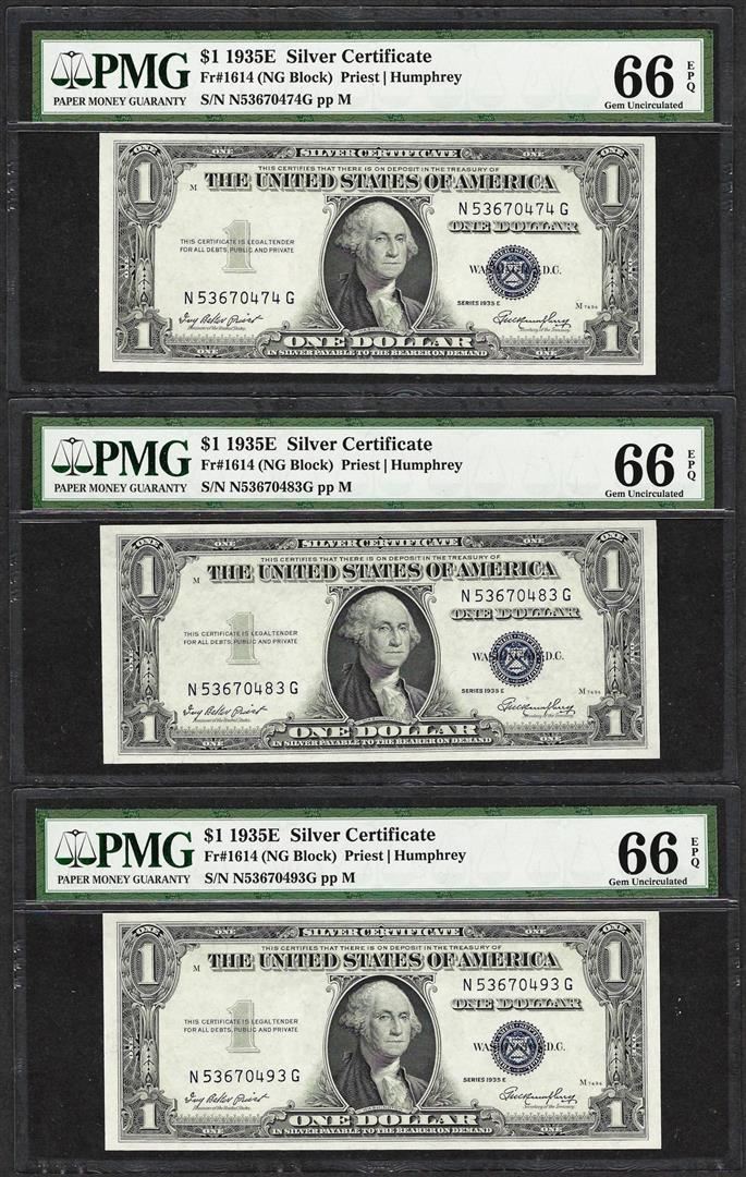One Lot of (3) 1935E $1 Silver Certificate Notes Fr.1614 PMG Gem Uncirculated 66EPQ. PMG Appraised.