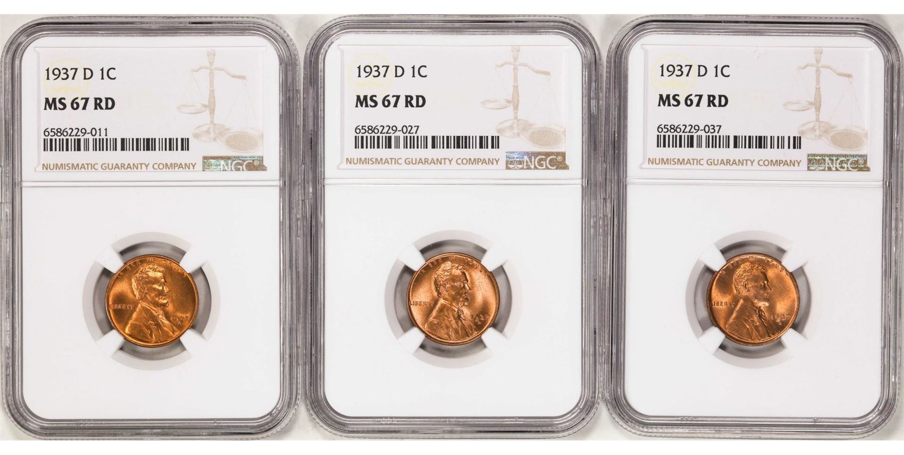 One Lot of (3) 1937-D Lincoln Wheat Cent Coins NGC MS67RD. NGC Certified.