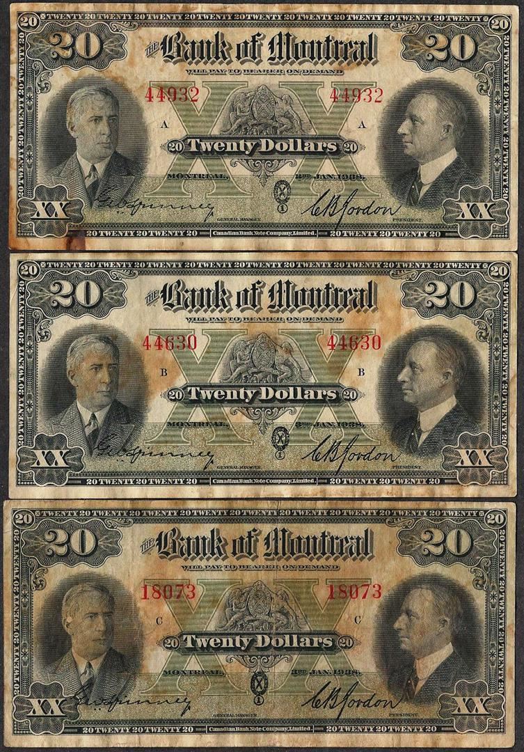 One Lot of (3) 1938 $20 The Bank of Montreal Canada Notes.