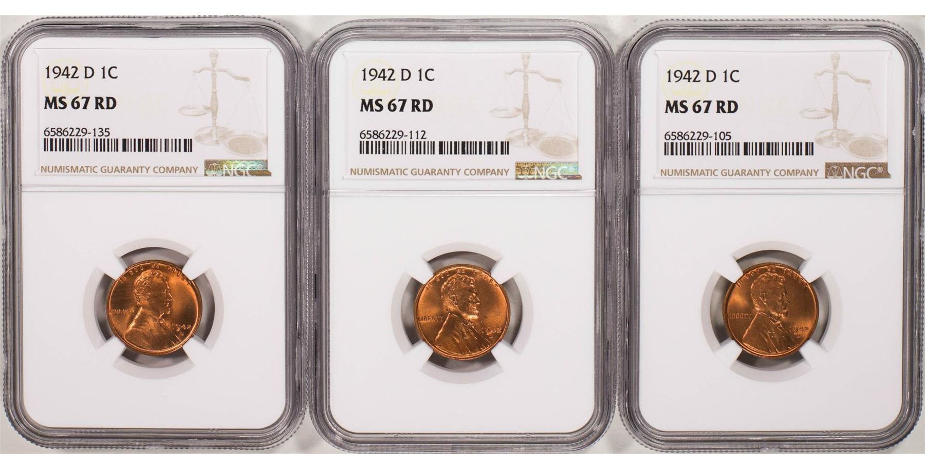 One Lot of (3) 1942-D Lincoln Wheat Cent Coins NGC MS67RD. NGC Certified.