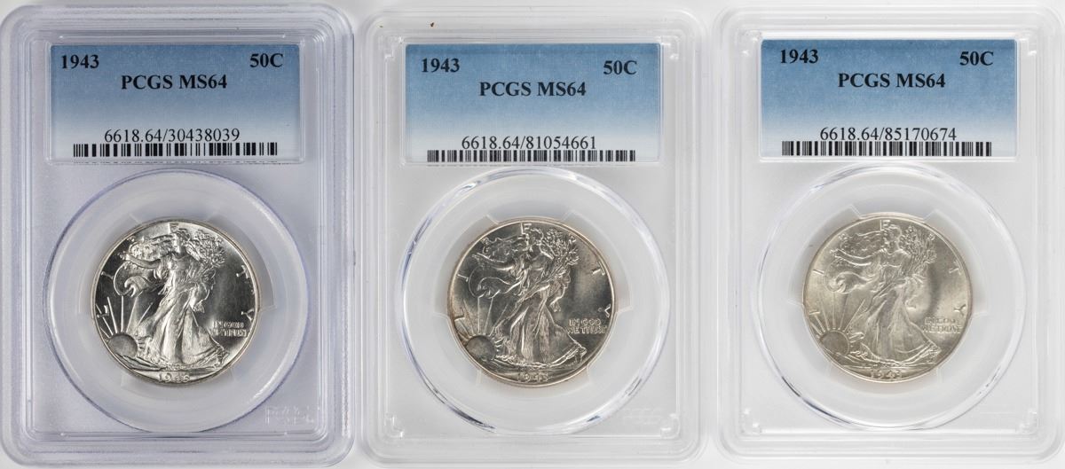 One Lot of (3) 1943 Walking Liberty Half Dollar Coins NGC MS64.