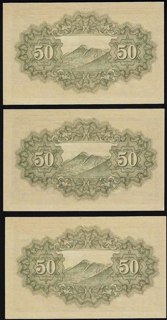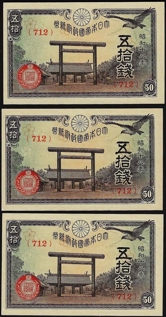 One Lot of (3) 1945 Japanese 50 Sen Notes.