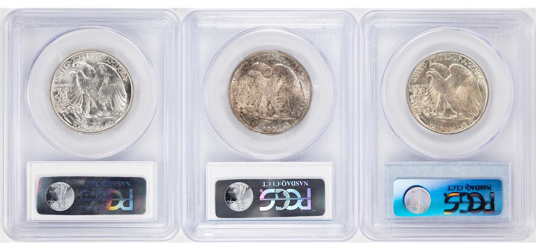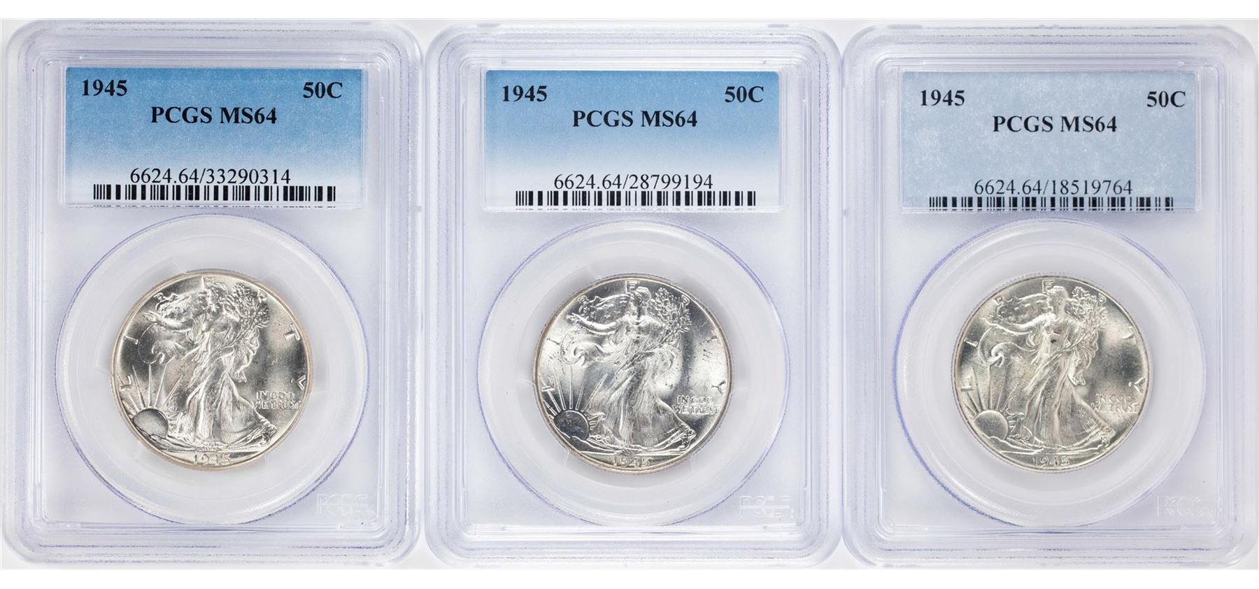 One Lot of (3) 1945 Walking Liberty Half Dollar Coins NGC MS64. NGC Certified.