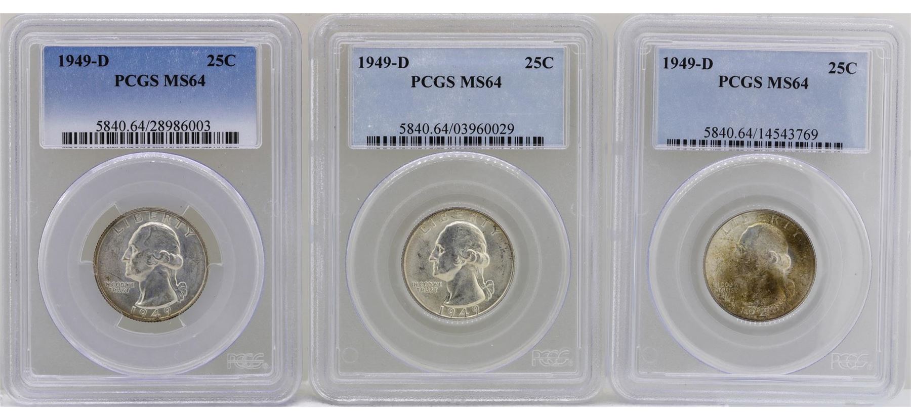 One Lot of (3) 1949-D Washington Quarter Coins PCGS MS64. PCGS Graded.